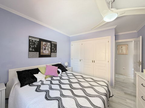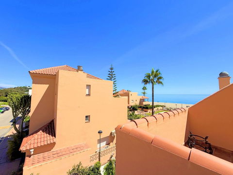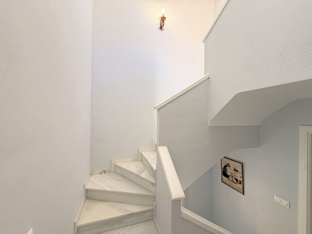 The property is distributed over two floors plus a spacious rooftop solarium with stunning sea views. It offers 3 bright and spacious bedrooms, a cozy living room, and a delightful Andalusian-style patio with fruit trees and direct access to the communal swimming pool and beautifully maintained gardens.