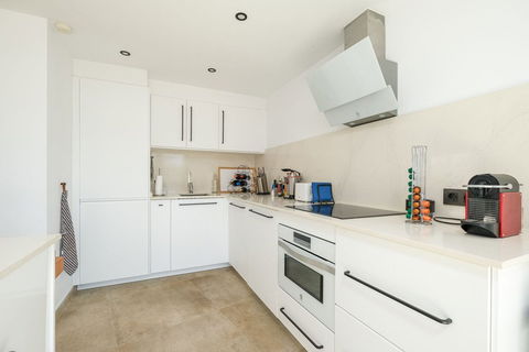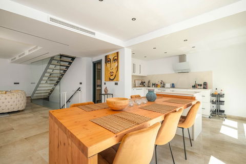 If you need storage, it's not a problem, there are lots of built-in and nicely hidden storage options. The kitchen and living room on the mezzanine level are open plan so you can socialize as much as possible. On the lower floor of the house there is an own small apartment with a kitchen, bedroom, bathroom and own patio, perfect when you have guests or older children visiting. The lower apartment also has its own entrance.