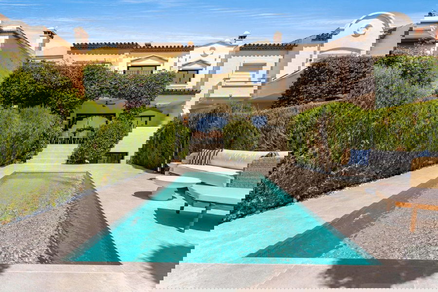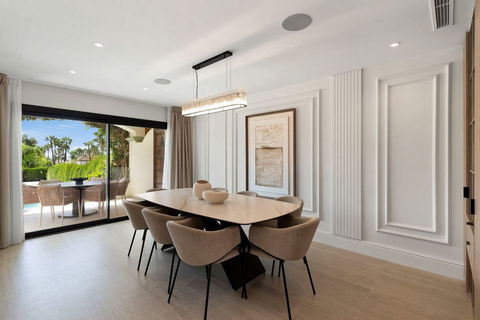 The ground floor opens out on to the garden terrace that has an additional dining area and out-side kitchen (A custom made completely solid surface matt white corian kitchen with BBQ, sink and fridge) complimented by a dining table for eight people, the ideal outside entertaining space. Moving out into the garden a salt water heated swimming pool awaits with additional seating and sun loungers.