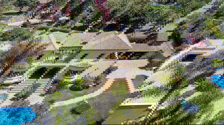 With a living area of 887 square metres, there is plenty of space for family living and entertaining. The spacious living rooms offer panoramic views of the gardens, orchards and surrounding mountains, creating an atmosphere of serenity and relaxation. The property sits on a generous plot of 2,909 square metres, which includes beautifully landscaped gardens, outdoor seating areas and two magnificent swimming pools, equipped with separate shower and toilet, perfect for cooling off on warm summer days.