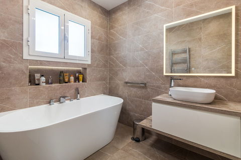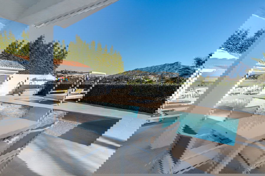 The villa's outdoor spaces are equally impressive, designed for the ultimate Mediterranean lifestyle. A private swimming pool takes centre stage, surrounded by a beautifully maintained garden with panoramic views of the mountains and countryside. Adjacent to the pool, a poolside house features an outdoor kitchen and living area, ideal for al fresco dining and entertaining. The expansive private terrace provides further opportunities for outdoor relaxation, while the automatic irrigation system ensures the garden remains lush and vibrant year-round.