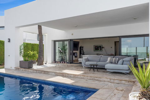 The interior comes fully furnished, showcasing a sleek, fully fitted kitchen, a bright dining room, and an inviting living area. Floor-to-ceiling glass doors flood the home with natural light while framing panoramic vistas of the sea, mountains, golf course, and surrounding greenery. Enjoy unobstructed views stretching across the coastline — a spectacular setting for entertaining or sunset cocktails.