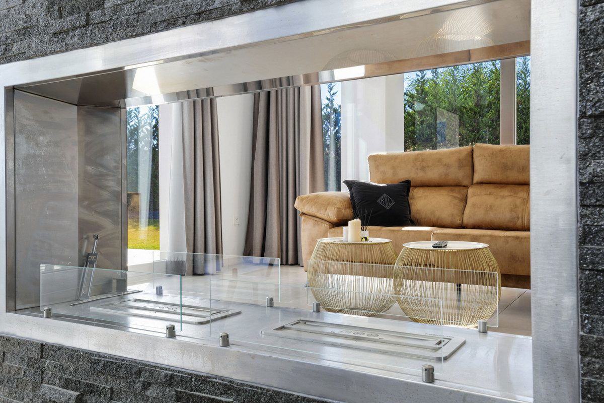 An impressive entrance hall with double-height ceilings welcomes you into the home, leading to a modern fully fitted kitchen equipped with premium appliances, a bright living area with fireplace, and a guest bedroom with an en-suite bathroom. Expansive terraces surround the entire house, seamlessly connecting indoor and outdoor living.