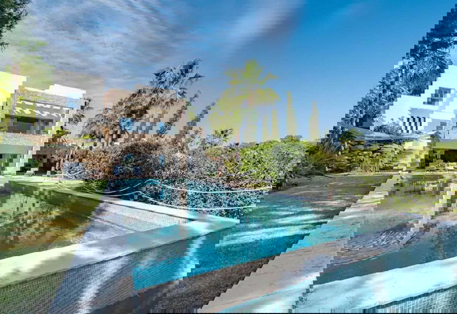 This magnificent villa is an open plan one, and the ground floor flows into the terrace and the garden with lovely sea views and a vast infinity pool, leading to a chill-out area with a fireplace. The villa has ensuite bedrooms on each floor, which gives you 100% privacy.