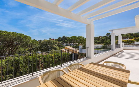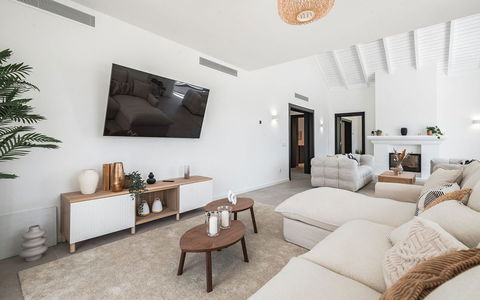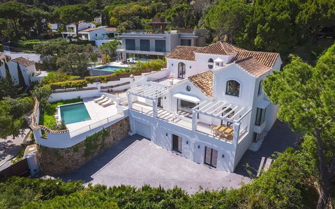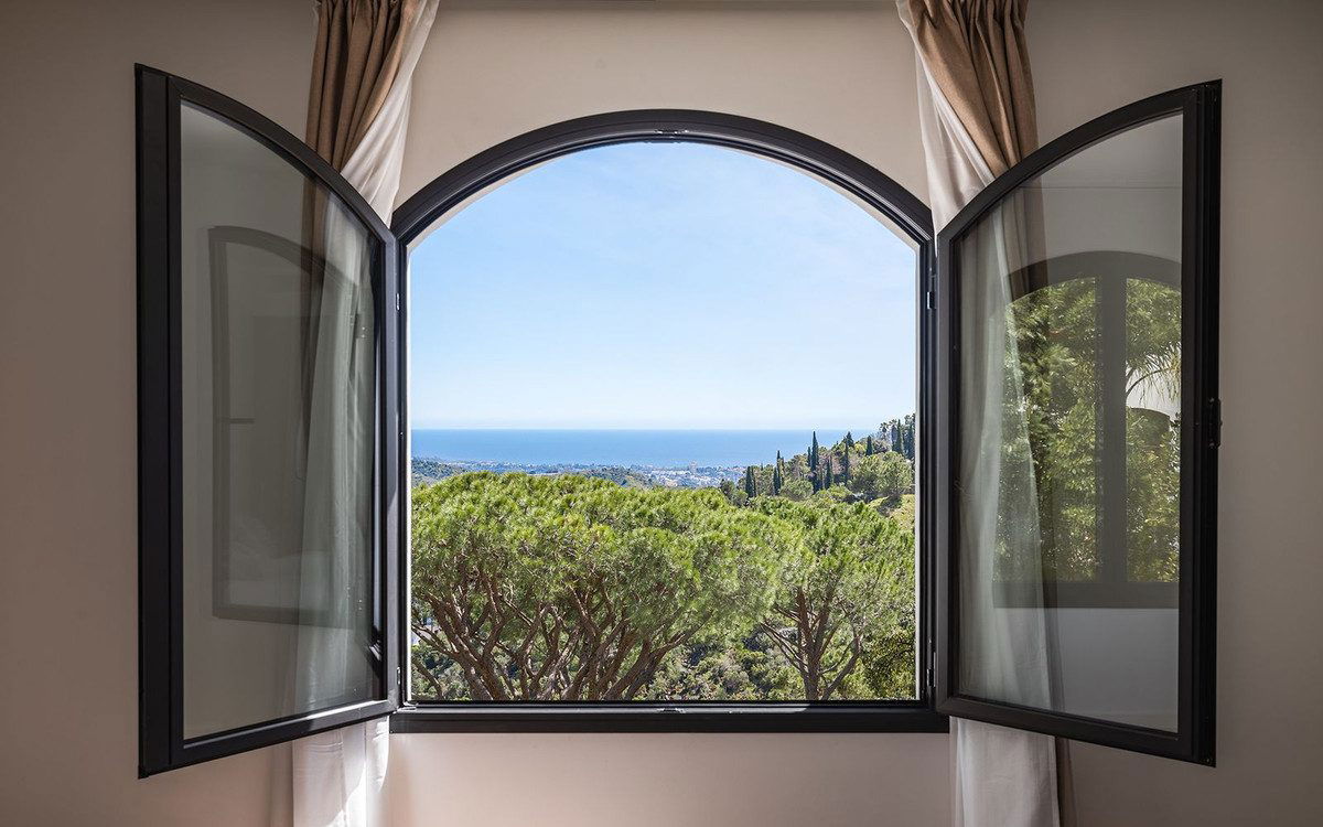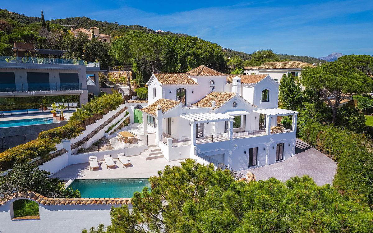 This elegantly renovated luxury villa offers a refined lifestyle within an exclusive, secure gated complex. Enjoying a desirable south to south- east orientation, the property boasts breathtaking sea views and abundant natural light throughout the day. The villa features five spacious bedrooms and five well-appointed bathrooms, providing ample space and comfort for both family and guests. The fully fitted eat-in kitchen combines functionality with style, ideal for casual dining, while a separate formal dining room offers an inviting setting for entertaining. The main living room provides a comfortable and stylish space to relax, complemented by a versatile entertainment room that can be adapted to suit a range of leisure activities. The home is equipped with underfloor heating throughout, as well as hot and cold air conditioning, ensuring year-round comfort. Outside, the private garden and swimming pool create a tranquil retreat, perfect for both quiet moments and social gatherings. Additional features include a generous driveway with access to a two-car garage, offering convenience and security. Situated in a gated urbanisation, the property guarantees peace of mind and a high level of privacy. The villa is sold fully furnished, allowing for a seamless transition and immediate enjoyment. Viewings are highly recommended to truly appreciate the quality, comfort, and stunning setting of this exceptional home. El Madroñal is only 2 minutes drive to Monte Halcones Commercial centre with its cafes, supermarket and shops, and a further 5 minutes to San Pedro Town and the beach.