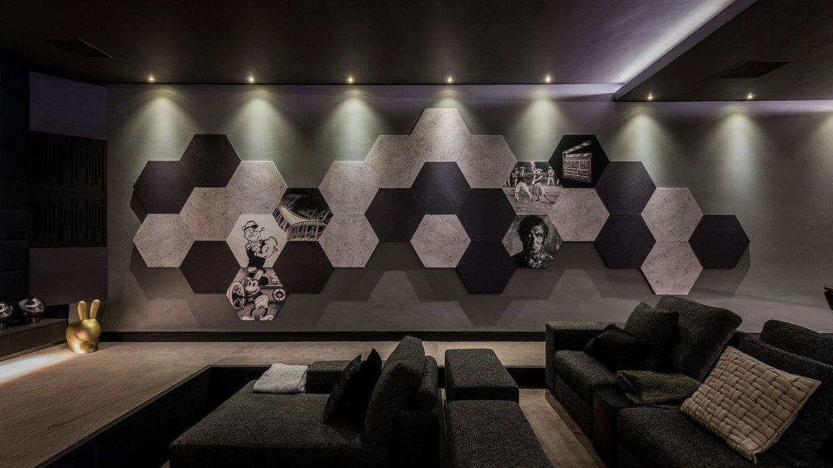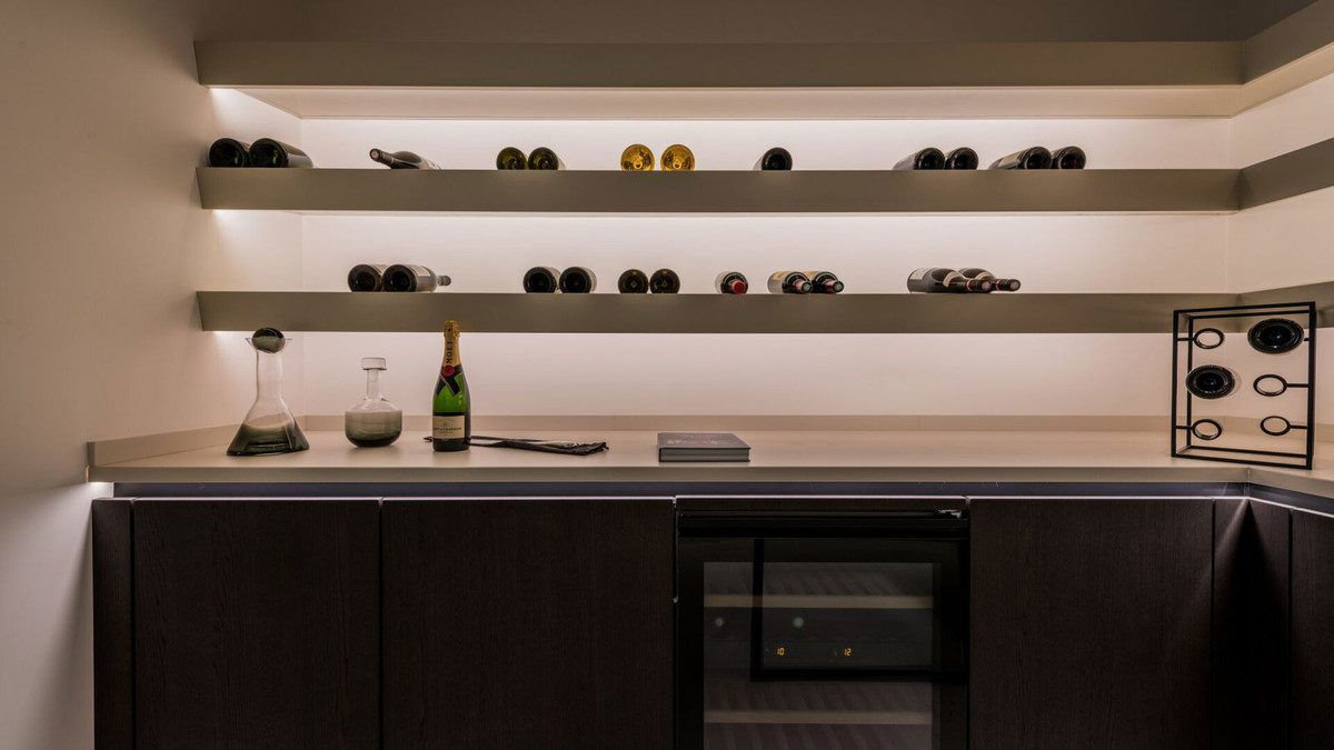 The main entrance with large vestibule, guest bathroom and lift, leads to the large open plan living and dining area with designer kitchen by Siematic including Gaggenau appliances. There is also service access to the kitchen from the car port at the street entrance to the villa. In the living area, silent electric pocket windows disappear neatly into the stone cladded walls to take us to the generous floating terrace where we can embrace the magnificent view of the Mediterranean and the Golf Course. This level of the villa is also home to the luxurious principal bedroom with private terrace, en suite bathroom and private dressing room.