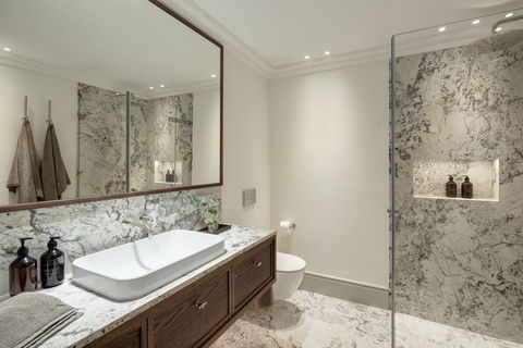 The home is thoughtfully distributed across two levels, harmonising with its natural surroundings. Upon entering through a bespoke front door with integrated glass detailing, natural light fills a sophisticated reception hall that opens into an elegant living space. Floor-to-ceiling Roman Clavero windows enhance the sense of openness while framing views of the landscaped garden and swimming pool. A semi-open dining area flows seamlessly onto a sun-drenched terrace featuring an outdoor kitchen and dining space, ideal for relaxed alfresco living. The interior kitchen is fully equipped with premium Miele appliances and a breakfast area. This level also includes three spacious en-suite bedrooms and a guest toilet.