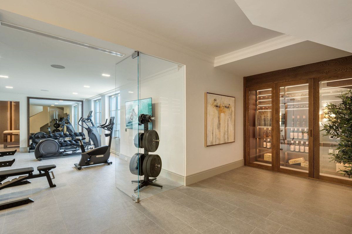 The lower level is dedicated to leisure and functionality, offering a private cinema, gym, massage room, wine cellar, service quarters, and two additional en-suite bedrooms with kitchenette. Technical areas are discreetly separated, enhancing efficiency and ease of maintenance. Integrated Zennio smart home technology provides intuitive control throughout.