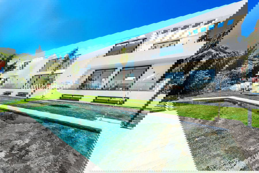 The villa is designed with modern living in mind, featuring a fully fitted kitchen, air conditioning, underfloor heating throughout, and a smart home system. The spacious interior of 912m² is complemented by porcelain floors, double glazing, and a fireplace, ensuring a comfortable environment year-round. The property also benefits from a Jacuzzi, a guest toilet, a laundry room, and ample storage space. For added security and convenience, there are surveillance cameras, a video entrance, and an automatic irrigation system for the garden.
