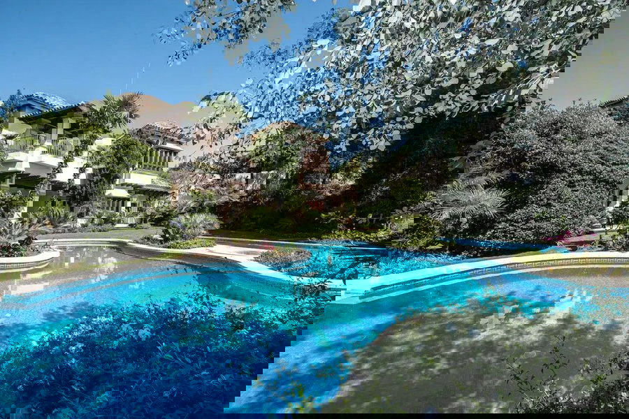 Terrace with distant views, 4 further bedrooms with terraces and marble bathrooms and 2 children's rooms with shared bathrooms. Generous living areas with charming and comfortable furnishings complete this Spanish flair. In total, the house also has 6 terraces (some with distant views), kitchen, 2 garages for 4 cars, a spacious and fully equipped fitness center and a wonderful pool area with 2 pools at different temperatures and a whirlpool.