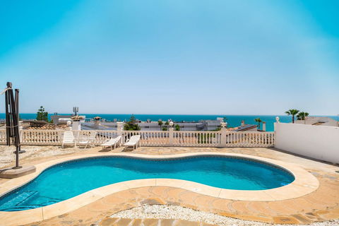 The villa features five well-proportioned bedrooms and three modern bathrooms, thoughtfully distributed across a light-filled layout. The open-plan living and dining area flows seamlessly into a fully equipped, contemporary kitchen, all oriented to capture panoramic views of the Mediterranean Sea.