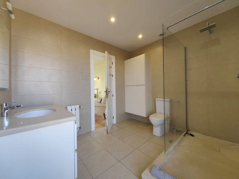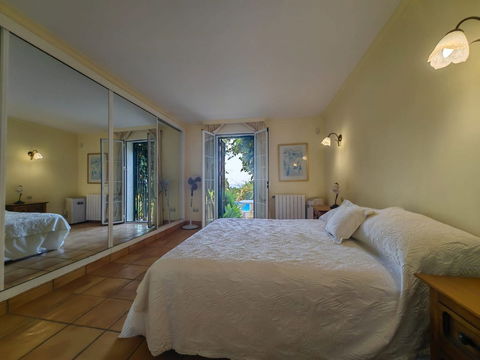 The villa comprises 3 spacious bedrooms, each with its own ensuite bathroom, plus a guest toilet. The ground floor features a large lounge with fireplace and dining area, a separate fully fitted kitchen, and a charming glassed-in west-facing dining patio perfect for enjoying sunsets all year round. From the lounge and covered terrace, the elevated position allows uninterrupted views over the pool and gardens.