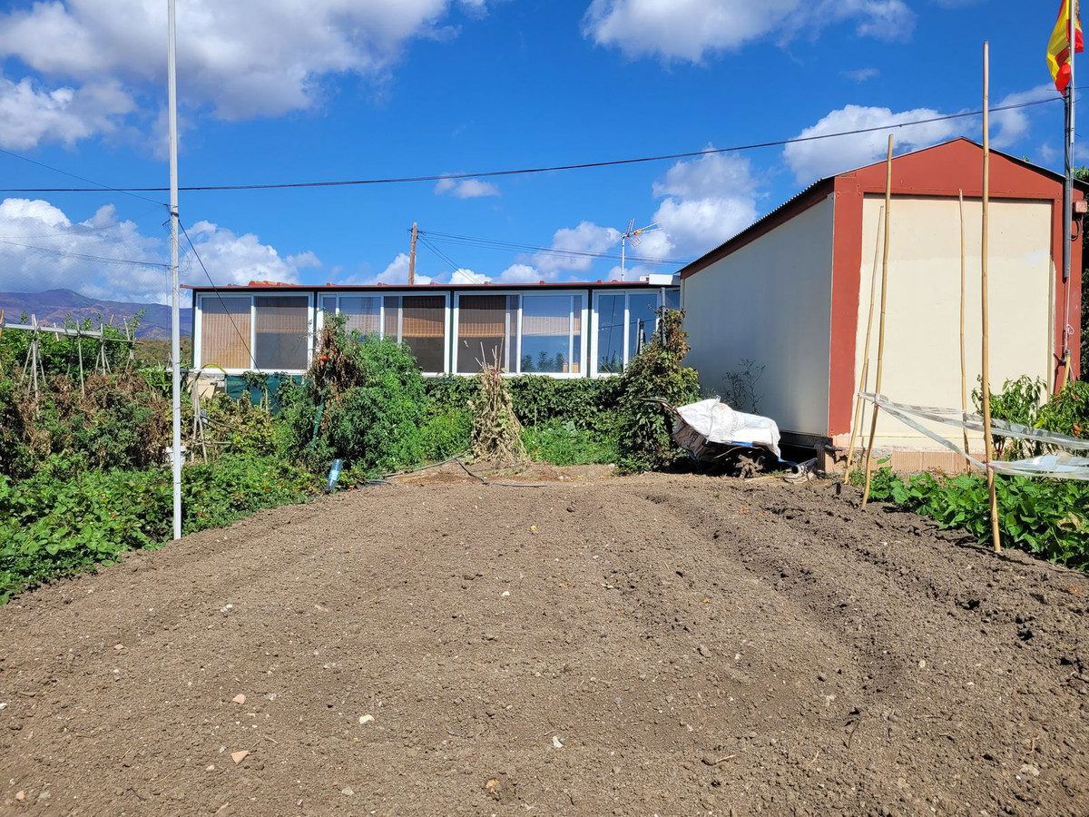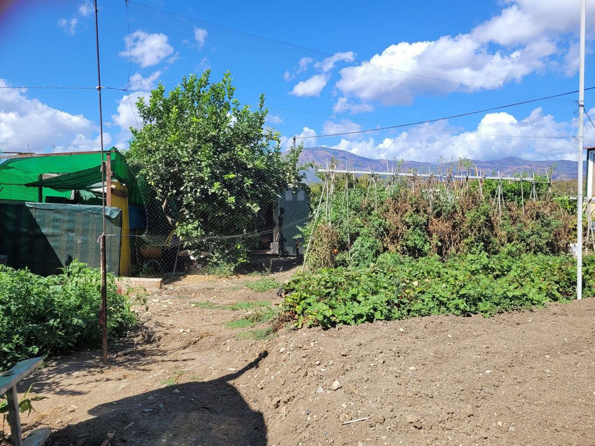 Parking area for three cars. Container and chicken coop. The orchard is about 200 square meters.