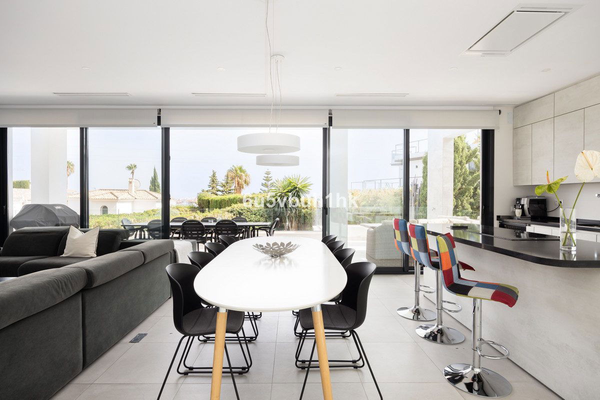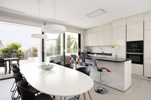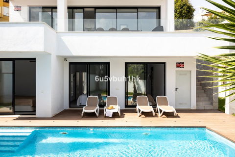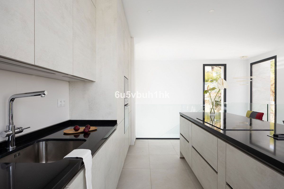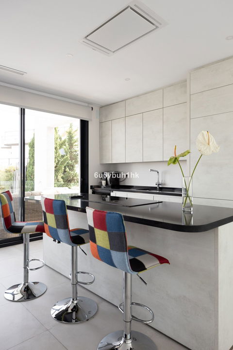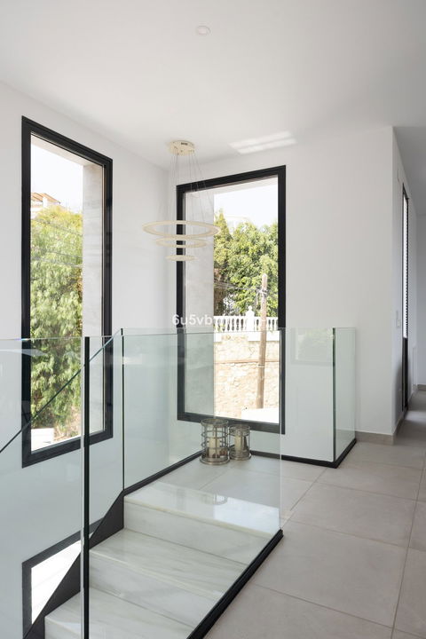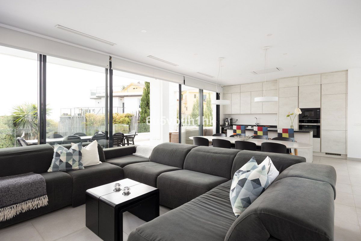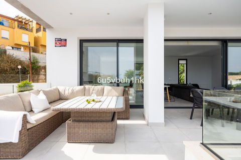 On the ground floor, you will find three spacious bedrooms, all with direct access to the terrace and pool area. The master bedroom features a luxurious en-suite bathroom and a generous walk-in closet. The upper floor impresses with an open-plan design, a state-of-the-art kitchen of the highest standard, and a bright living room. From here, you can access the large terrace, perfect for social gatherings with a dining area, lounge space, and barbecue, as well as partial sea views.