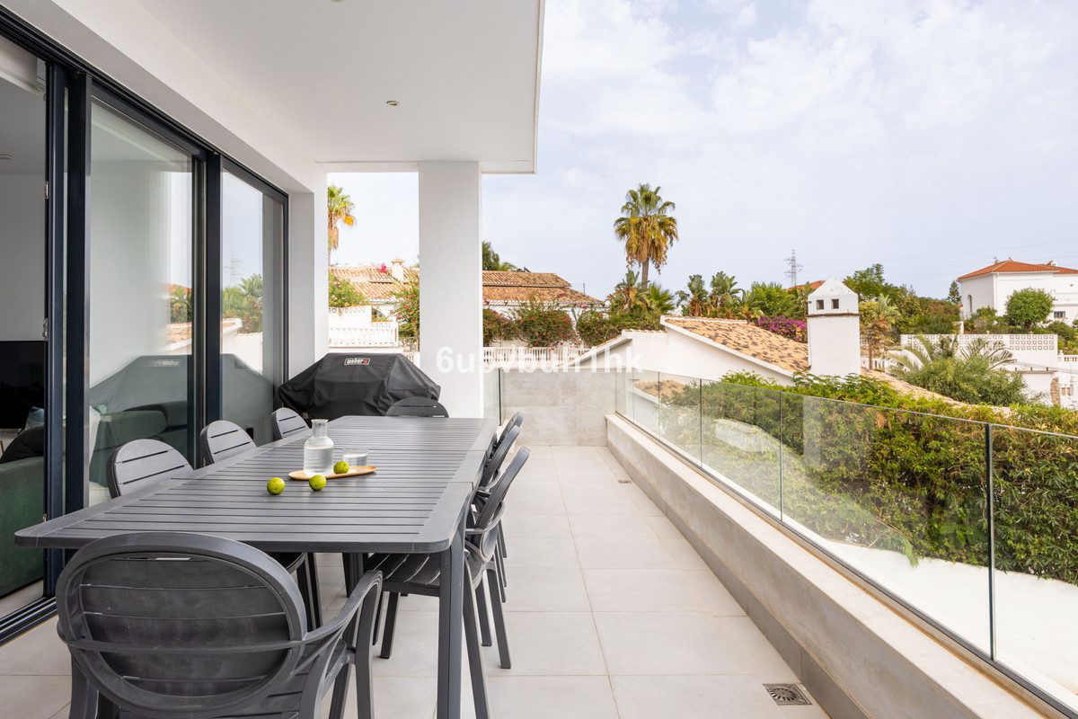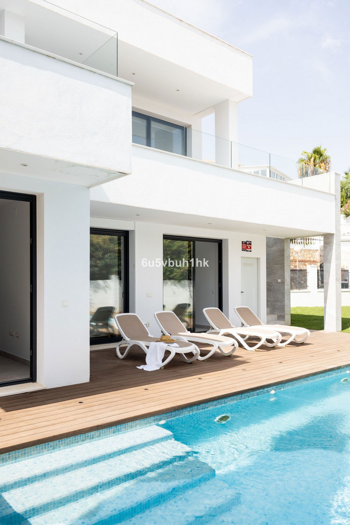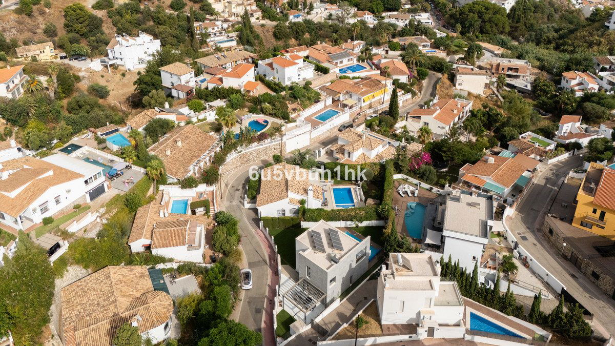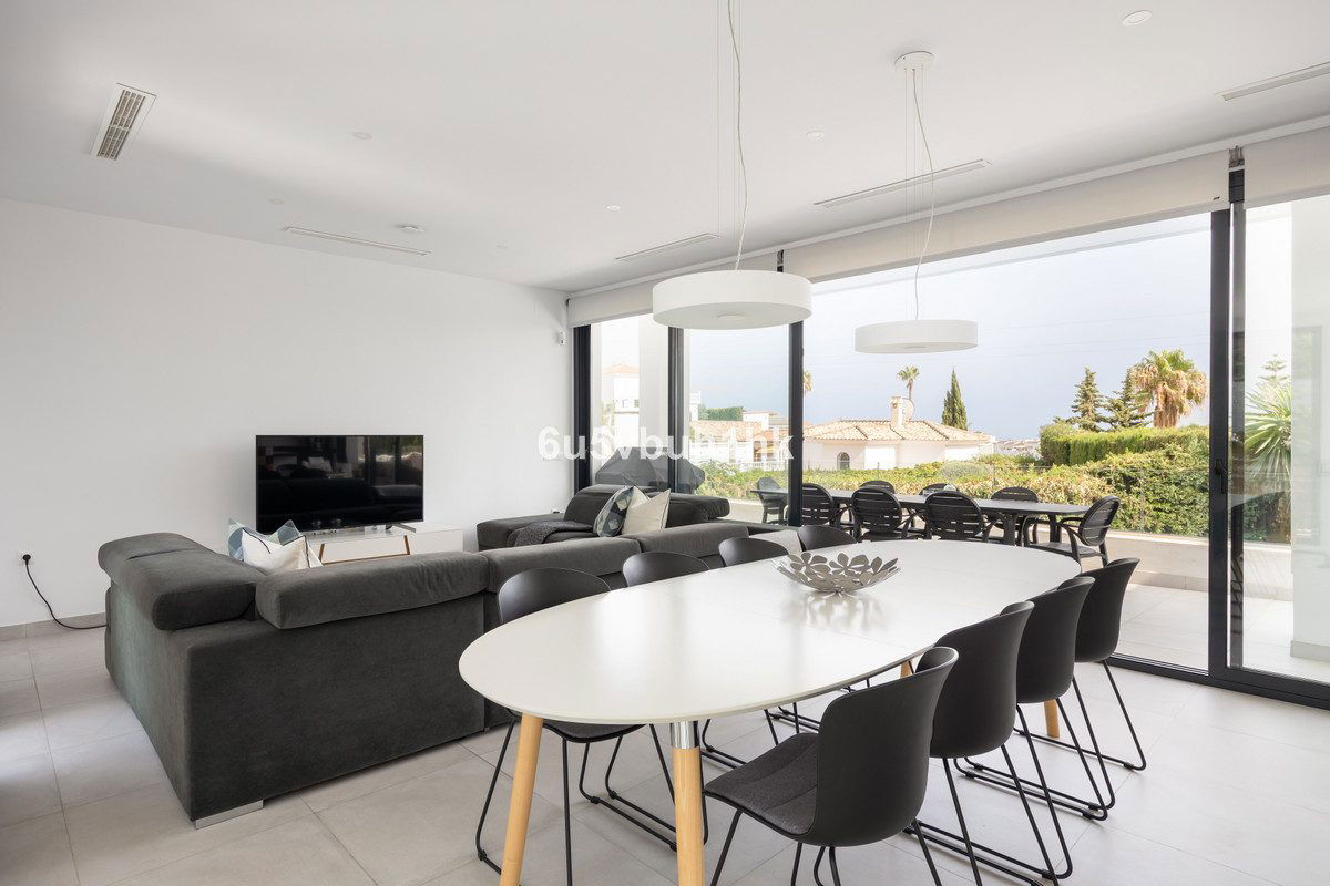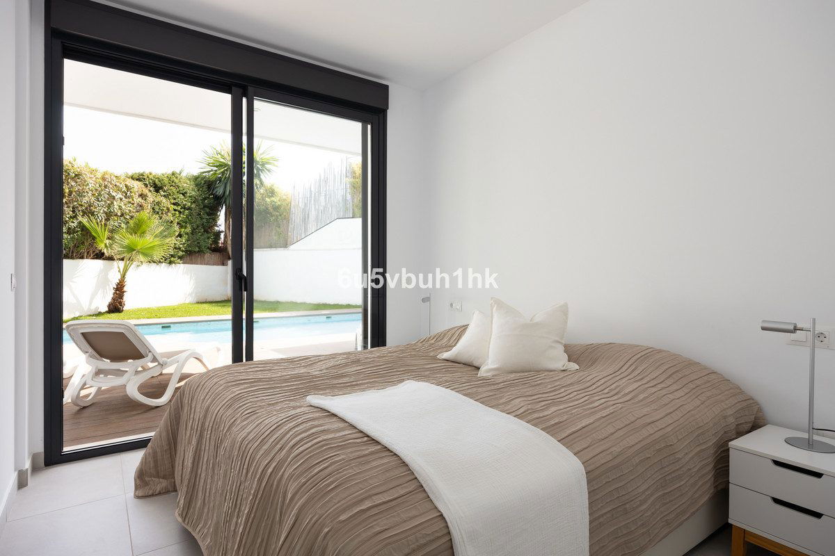 On the ground floor, you will find three spacious bedrooms, all with direct access to the terrace and pool area. The master bedroom features a luxurious en-suite bathroom and a generous walk-in closet. The upper floor impresses with an open-plan design, a state-of-the-art kitchen of the highest standard, and a bright living room. From here, you can access the large terrace, perfect for social gatherings with a dining area, lounge space, and barbecue, as well as partial sea views.