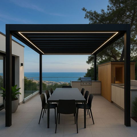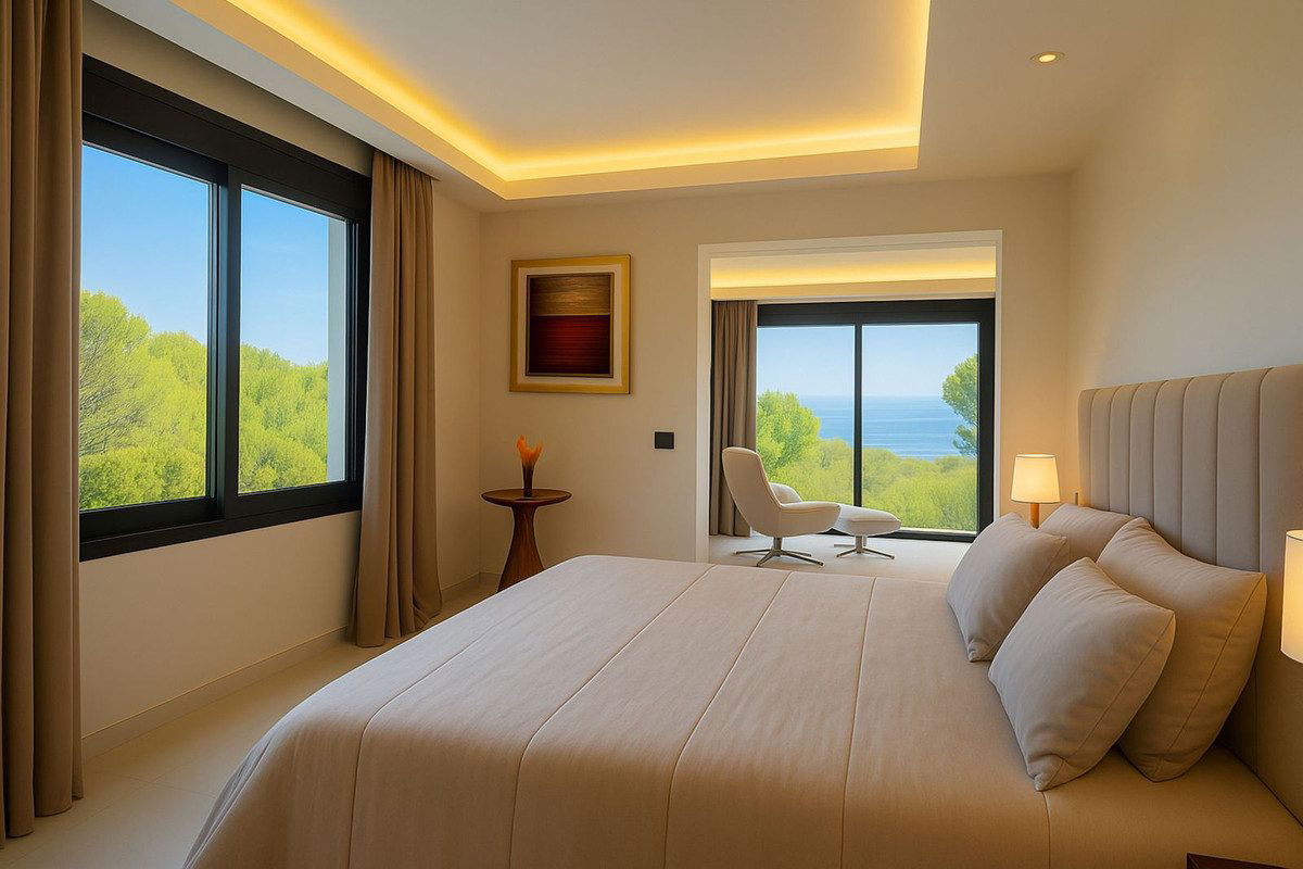 Inside, enjoy bright open-plan spaces, a German Nolte kitchen with Miele appliances, and elegant designer finishes throughout. The main suite includes a private terrace, dressing room, and spa-style unique bathroom. Two additional ensuite bedrooms also feature terraces with sea and forest views.