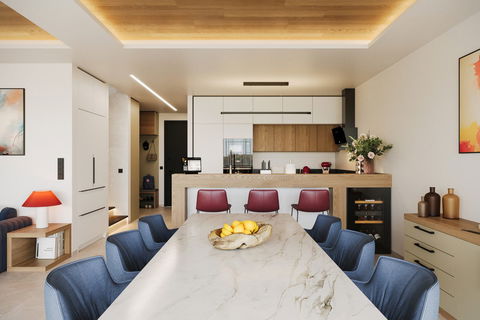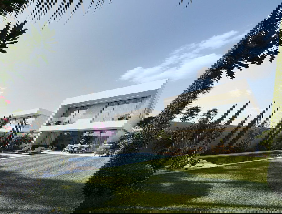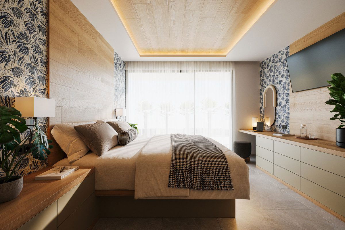 In addition, the villa will be partially furnished with custom-made furniture, which is included in the quoted price. We will be pleased to provide you with a list and technical specifications upon request. Essentially, you will receive all items shown in the visuals, with the exception of the sofa, armchair, chairs, bar stools, mattresses, TV, outdoor furniture, barbecue, and decorations, which can be purchased according to personal preferences.