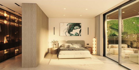 Upstairs, the master suite offers a true retreat of over 45 m², complete with a luxurious dressing area, en-suite bathroom, and a private lounge opening onto a panoramic terrace. Two further double bedrooms, each with en-suite bathrooms and walk-in wardrobes, are located across the hall, also accessible via elevator.