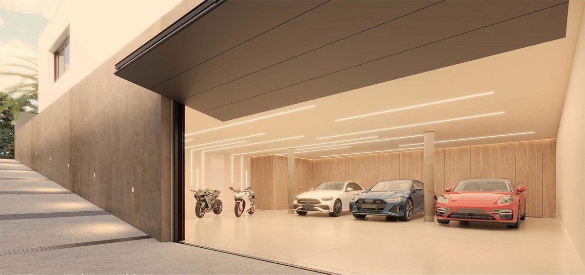 The ground floor welcomes you through a striking entrance hall, where the elevator connecting all levels of the home is discreetly located. From here, you step into a spacious 80 m² living area, elegantly divided into two ambient lounges and seamlessly connected to a sleek, open-plan kitchen — perfect for entertaining or family living. Also on this level is a guest bedroom with a walk-in closet and en-suite bathroom, offering both privacy and comfort. The main living area opens onto a spectacular partially covered terrace, leading out to the meticulously designed exterior.