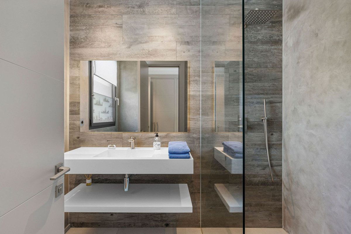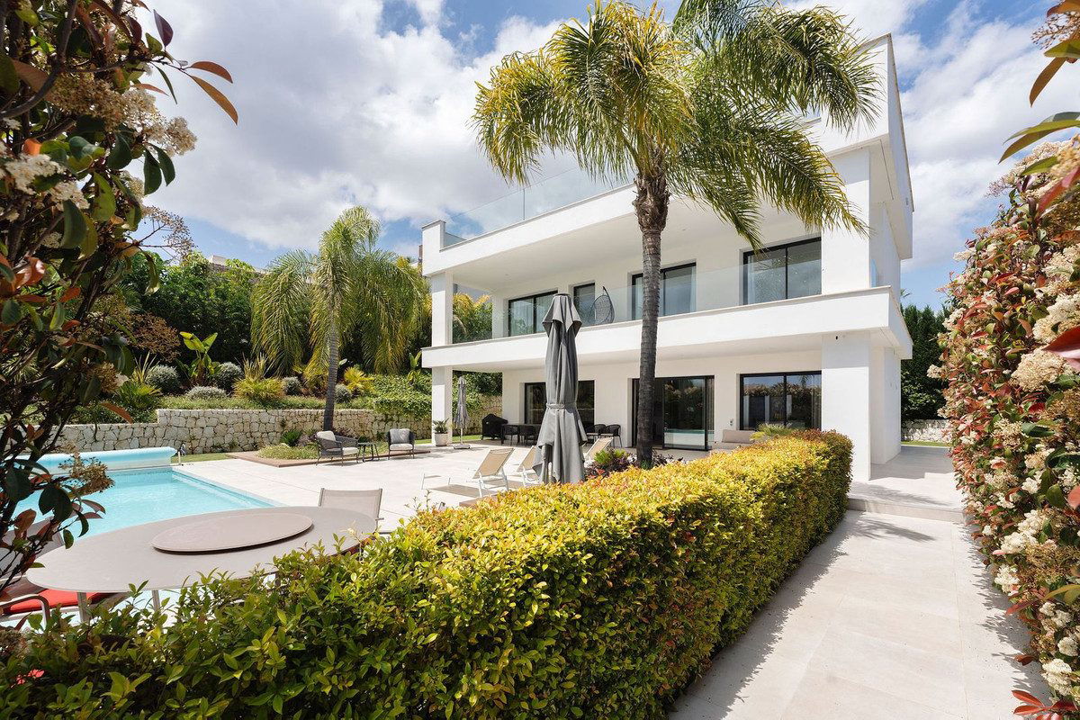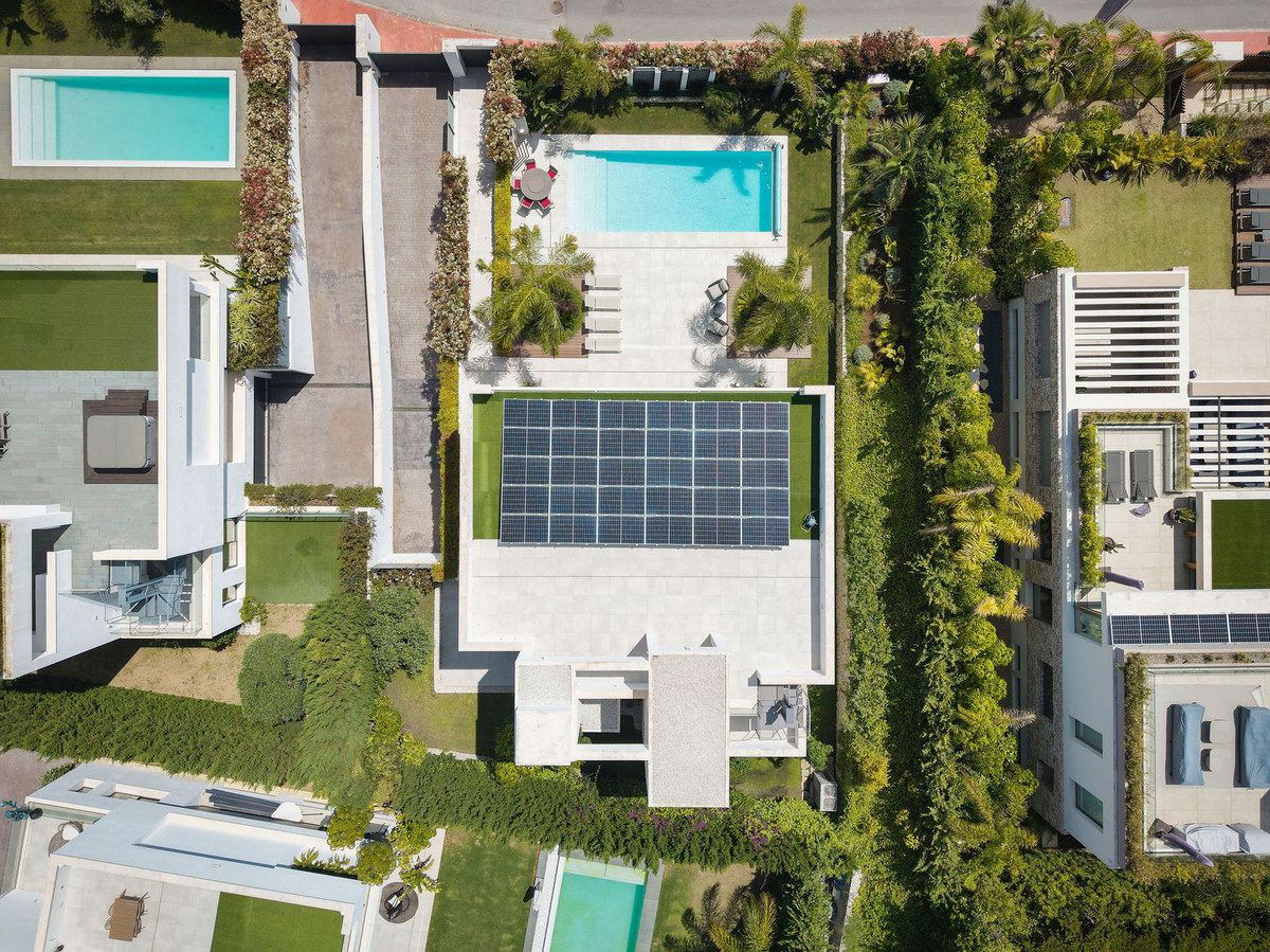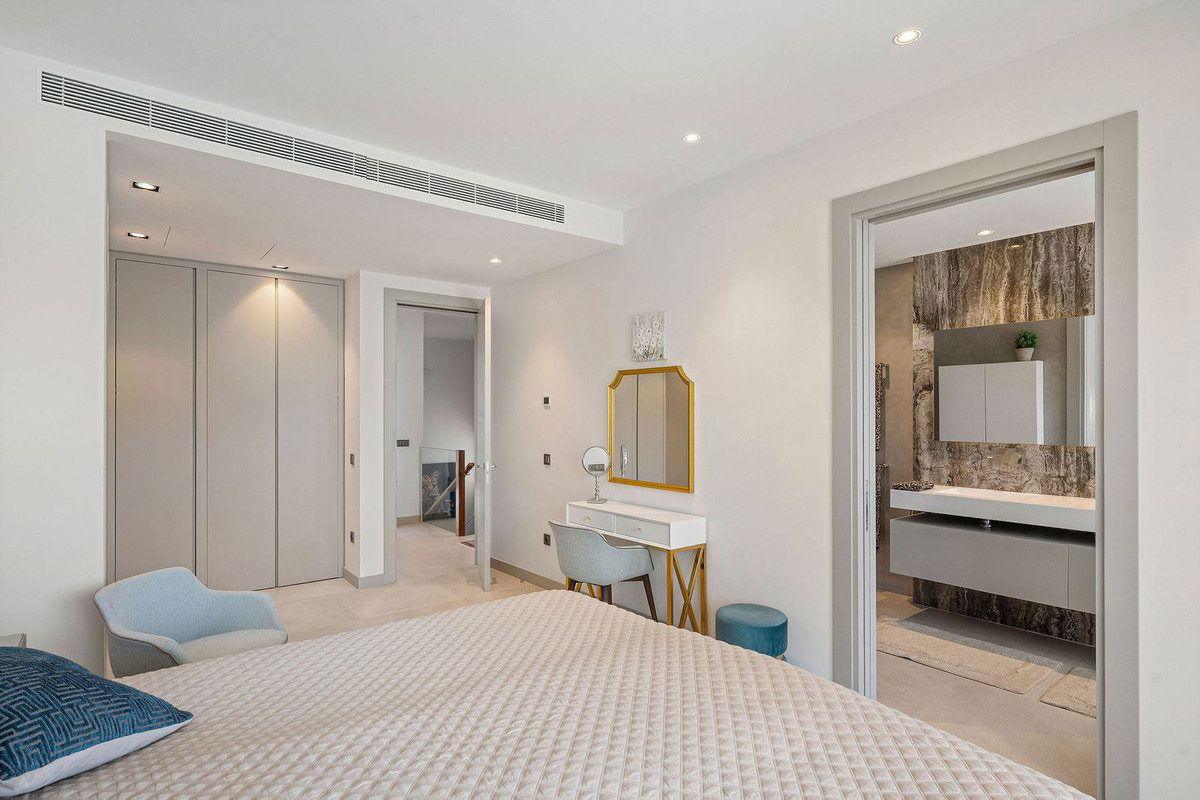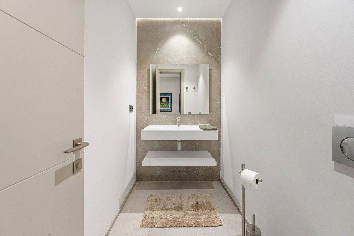 Welcome to this modern and very well built house in the lower Nueva Andalucia area. As you enter you are greeted with a large open kitchen that leads to the dining and living area, from here you can access the large covered terrace and onto the pool area with ample space for sunbathing and with an outdoor shower. On the main floor you have a bedroom onsuite currently used as an office. On the first floor you have 3 bedroom onsuite, all with access to a covered terrace. From here you have stairs leading onto the solarium which has been fitted with solar panels yet leaving space to create an entertaining space. In the basement floor floor you have the laundry area, a 2nd guest toilet, a bedroom suite, a large room that could be used as a cinema room etc and lastly a large garage for up to 4 cars. All floors are accessed by stairs or an elevator. The technology in the house is modern with water based underfloor heating powered by aerothermic system, the ac is thorugh the Airzone system, water filters & solar panels make this house very efficient to live in. A house in a very central position makes this a perfect all year living or a holiday home with the added bonus of being an attractive rental property due to its size and location.