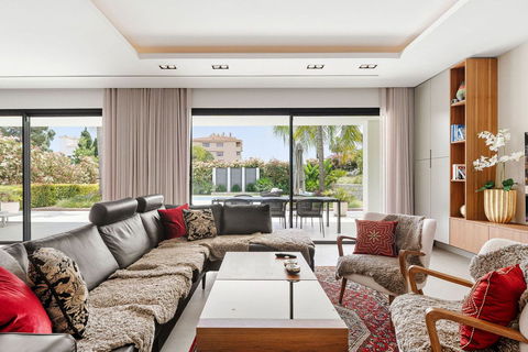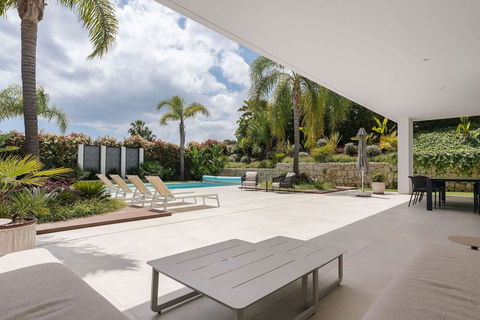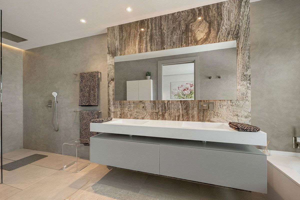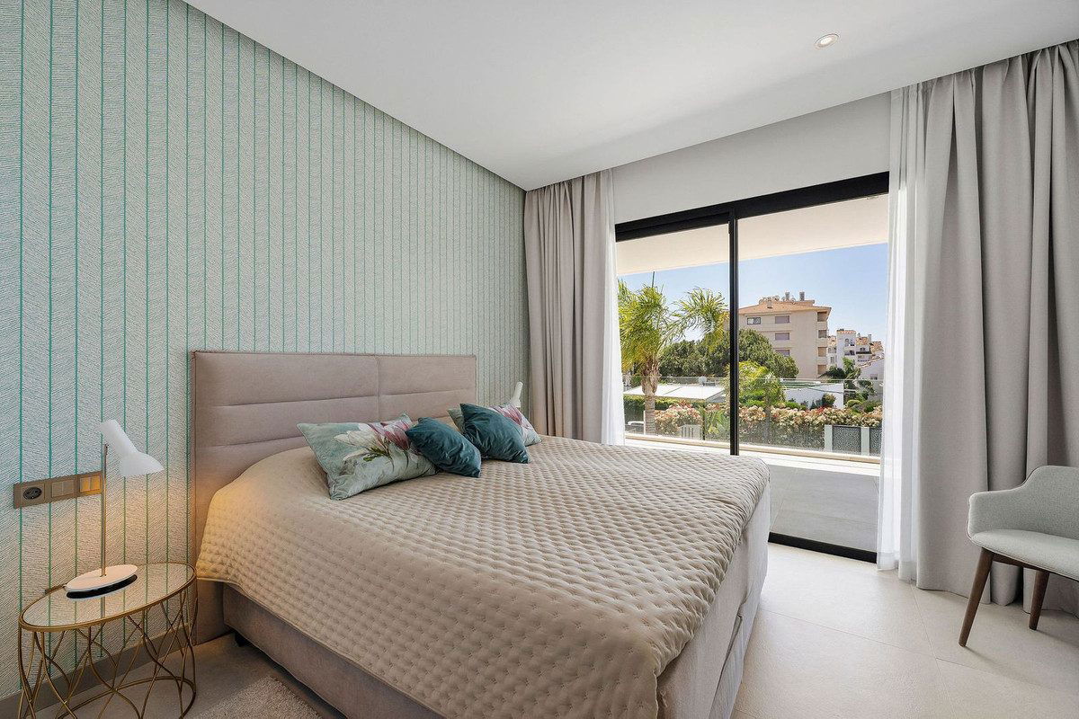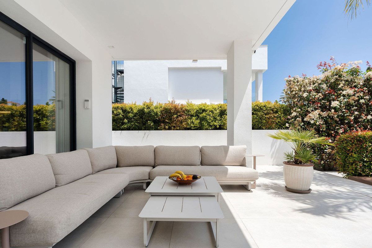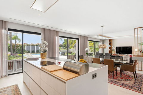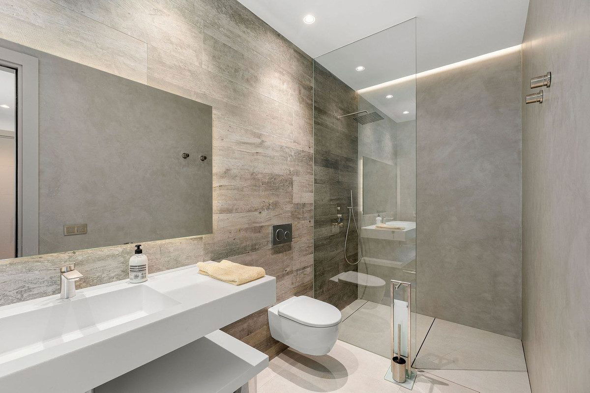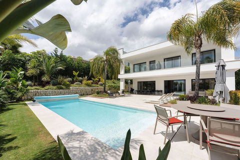 Welcome to this modern and very well built house in the lower Nueva Andalucia area. As you enter you are greeted with a large open kitchen that leads to the dining and living area, from here you can access the large covered terrace and onto the pool area with ample space for sunbathing and with an outdoor shower. On the main floor you have a bedroom onsuite currently used as an office. On the first floor you have 3 bedroom onsuite, all with access to a covered terrace. From here you have stairs leading onto the solarium which has been fitted with solar panels yet leaving space to create an entertaining space. In the basement floor floor you have the laundry area, a 2nd guest toilet, a bedroom suite, a large room that could be used as a cinema room etc and lastly a large garage for up to 4 cars. All floors are accessed by stairs or an elevator. The technology in the house is modern with water based underfloor heating powered by aerothermic system, the ac is thorugh the Airzone system, water filters & solar panels make this house very efficient to live in. A house in a very central position makes this a perfect all year living or a holiday home with the added bonus of being an attractive rental property due to its size and location.