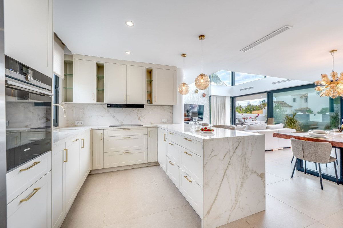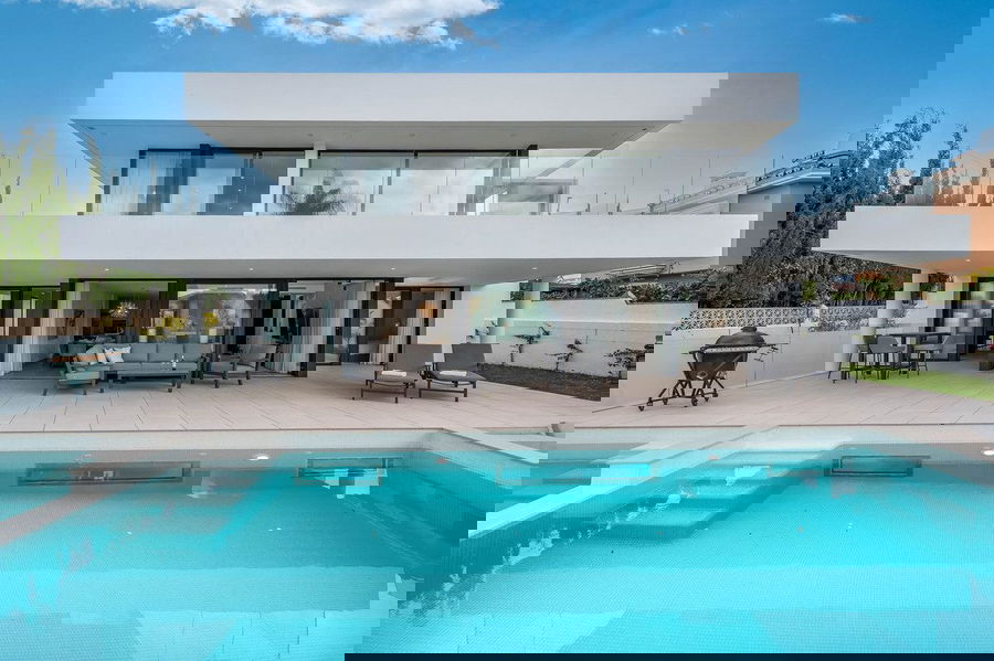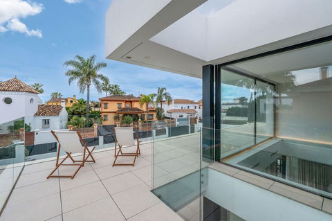 Welcome to a newly completed architectural gem located in the exclusive Montecarlo urbanization of San Pedro de Alcántara. This elegant 5-bedroom villa, spanning over 786 m² of built space across three impeccably designed levels, blends cutting-edge design with warm Mediterranean comfort — just a short stroll from the beach and the vibrant town center.