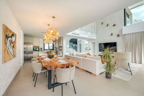 Step into expansive open-plan interiors bathed in natural light, where double-height ceilings and full-length sliding glass doors blur the line between indoor sophistication and outdoor serenity. The heart of the home is a stunning living area seamlessly connected to a gourmet kitchen clad in marble finishes, and a bespoke dining space that opens out onto a sun-drenched terrace.