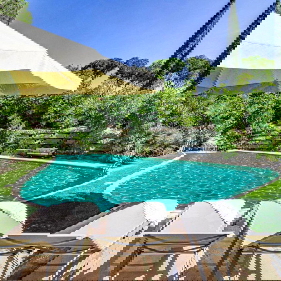 The outdoor areas are designed for relaxation and entertainment, featuring a private swimming pool, landscaped gardens, spacious terraces, a covered porch, and a BBQ area — perfect for enjoying the Andalusian sunshine.