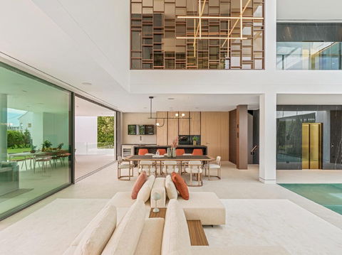 Main floor: expansive open-plan living and dining with double-height ceilings, fully fitted designer kitchen with direct access to terraces, gardens, and two pools.