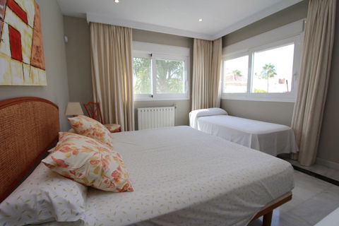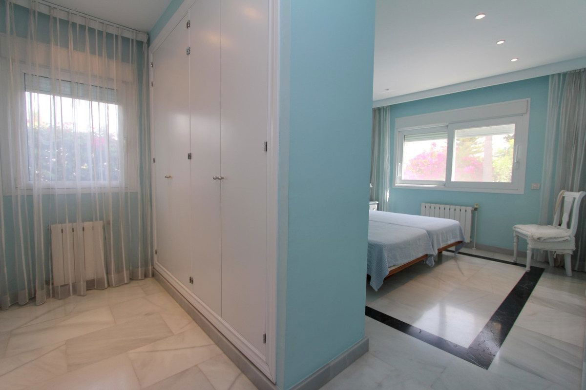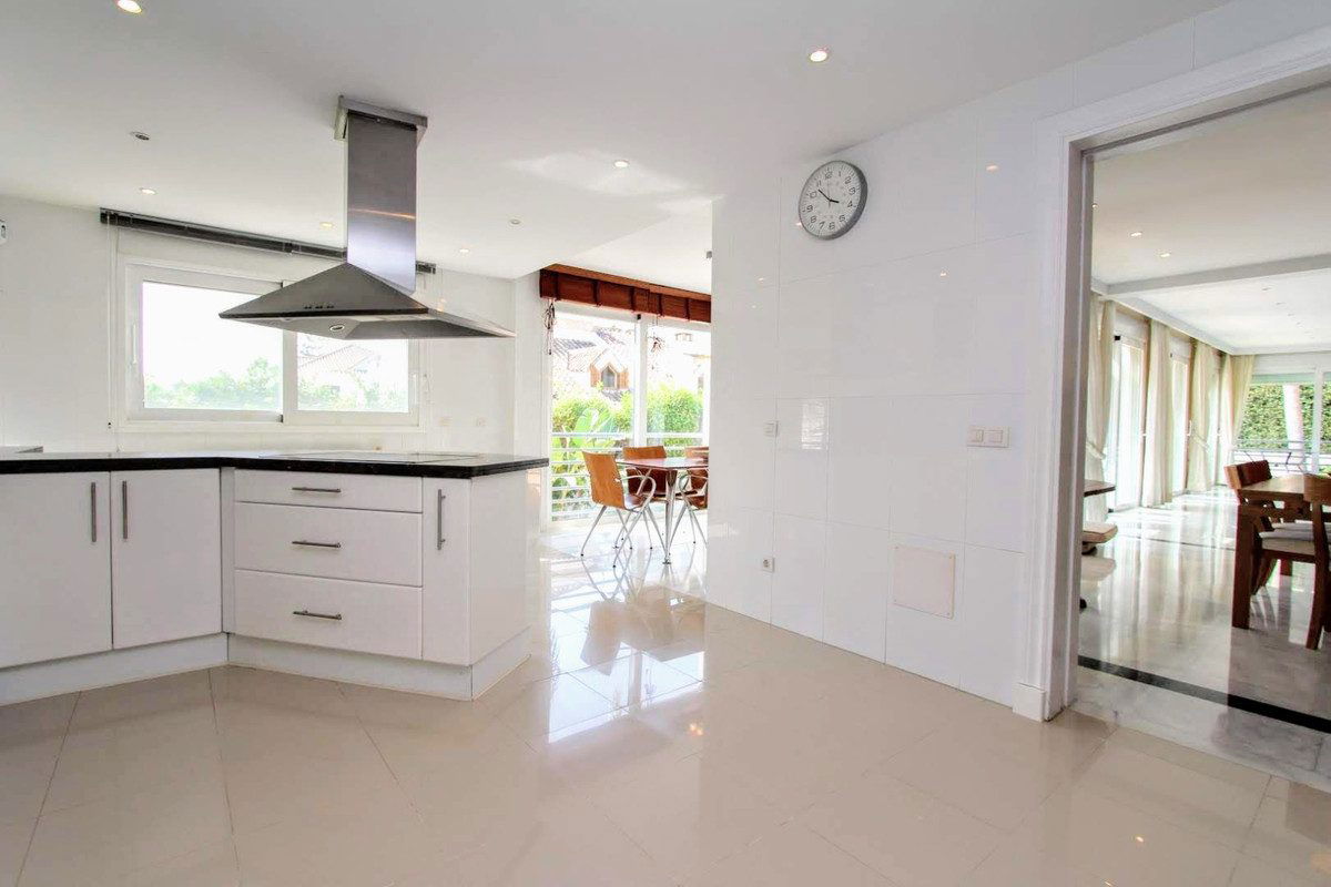 Spacious beachside villa in popular San Pedro, a short drive west of Marbella and Puerto Banús, and within walking distance of the beach promenade, shops and restaurants. This house is set in manicured gardens with a swimming pool, offering a perfect combination of indoor and outdoor spaces, including a fantastic 120m2 roof terrace with panoramic views.