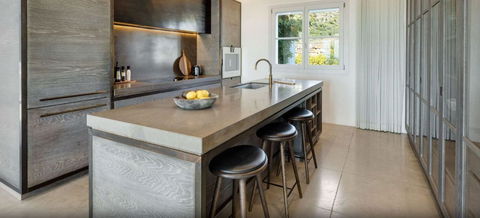 The ground floor also includes two spacious en-suite bedrooms, each with direct access to the landscaped gardens adorned with exquisite stonework, creating a serene atmosphere. The open-plan modern kitchen, equipped with high-end Gaggenau appliances, combines sleek Scandinavian design with superior functionality, making it perfect for daily use or hosting guests.