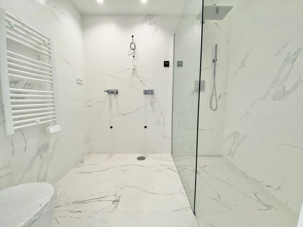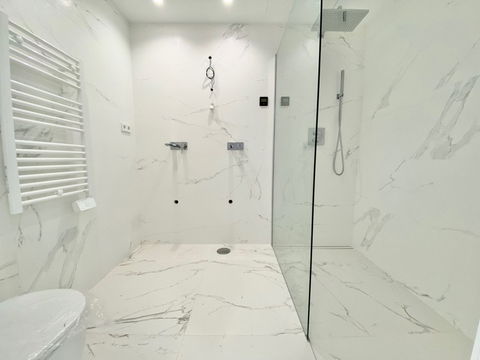 – Porcelanosa flooring and wall coverings, Roca faucets.