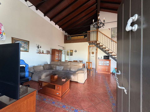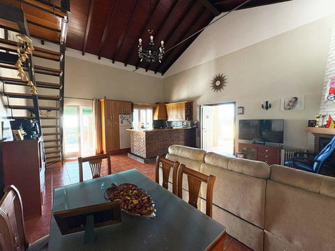 The villa is full of character, featuring high beamed ceilings and a large open fireplace in the spacious living and dining area, creating a cozy and inviting atmosphere.