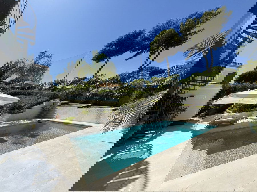The open-plan living area connects to a modern kitchen and opens out to sunny terraces, a landscaped garden, and a private pool. On the rooftop, a large terrace provides panoramic views of the golf course and surrounding landscape — perfect for relaxing or entertaining.