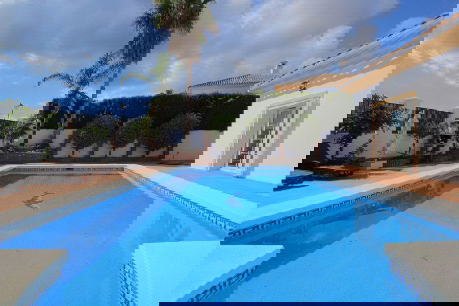 This impressive villa in La Cala Golf offers truly panoramic sea and mountain views. The main house is all on one level, and offers: a double car port, 4 en suite bedrooms, a guest cloakroom, a huge kitchen with central island, a separate utility, and two separate living rooms, both of which lead to the very large pool and terrace area. The lower level of the house is an independent 3 bedroom 2 bathroom apartment with living room and kitchen, large terrace, and access to a second pool and terrace area, plus a second driveway entrance and double garage. An investor´s dream, the house has an LPO and is ready to love in or rent out straight away. You could live one part and rent out the other, rent it out as two separate properties, or as a 7 bedroom house, the choice is yours… Offers are invited for this Wow-factor house!