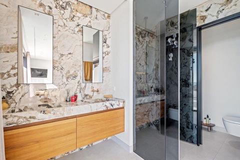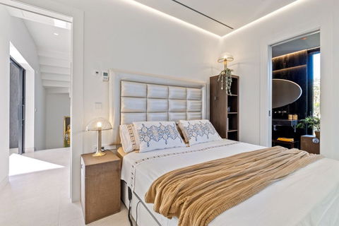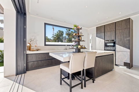The heart of the home is its open-concept kitchen, equipped with Siemens appliances, a hidden pantry, and a Liebherr fridge, all seamlessly integrated for an impeccable culinary experience.