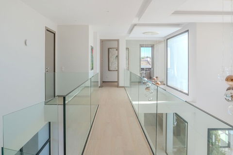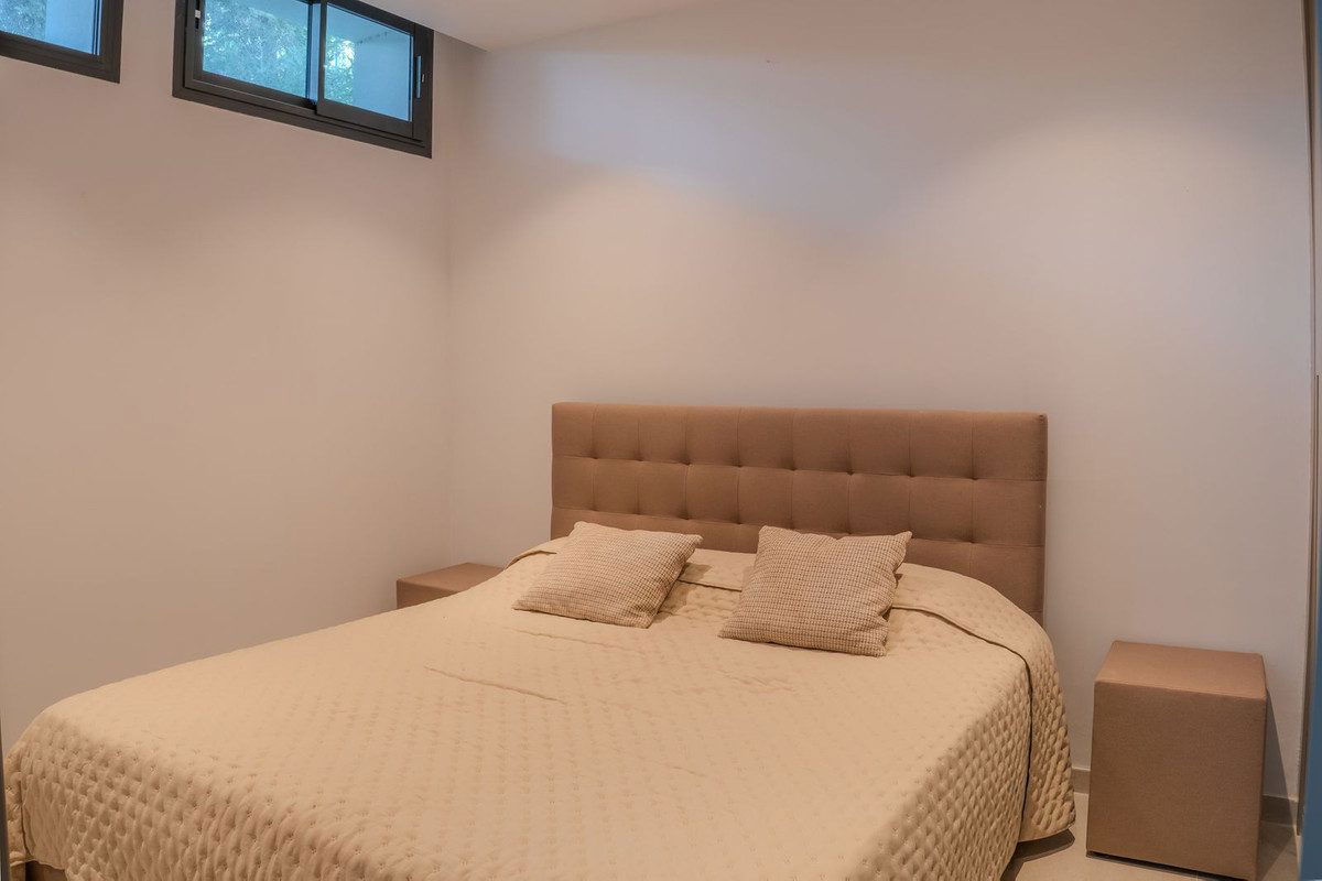 There is one large guest bedroom with en suite bathroom as well as a powder room on the same floor. The wide floating gallery staircase takes us to the first floor, where we find two fabulous bedrooms with en suite bathrooms and access to their own private terraces. One of the bedrooms belongs to the Master Bedroom suite with a spacious dressing room, full bathroom with a bathtub, walk-in shower and double sink. Both bedrooms enjoy lovely sea view from this level, which also leads us to an outside staircase up towards a 100m2 solarium on the top of the villa. Here we have amazing sea views and plenty of space for a chill out, jacuzzi, outdoor gym, a BBQ area, etc..