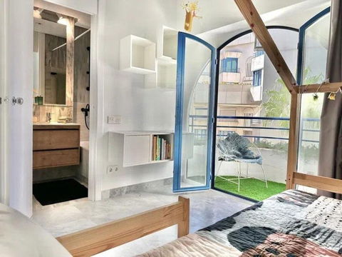Upstairs there are 2 bedrooms each with en-suite bathroom. The master bedroom is spacious, has a nice urban view and offers a nod to the sea. The second bedroom also has a private balcony overlooking the garden and pool.