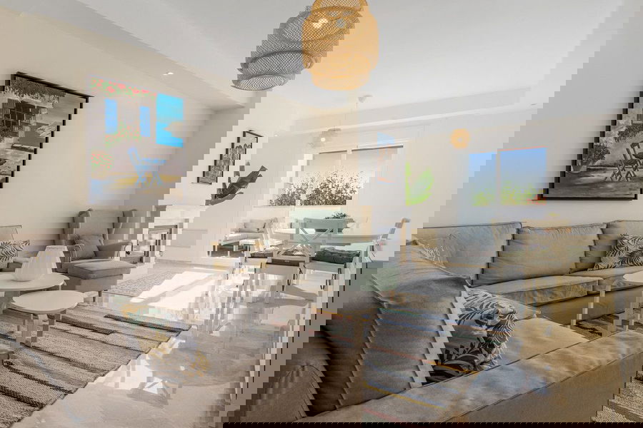 This stylish and sun-drenched duplex apartment boasts a spacious open-plan living and dining area with direct access to a private terrace, perfect for enjoying Marbella's sunshine. The interiors are tastefully decorated in a soft Mediterranean palette, featuring comfortable, modern furnishings, a cozy fireplace, and high-quality finishes throughout.