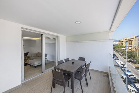 The duplex penthouse offers a spacious living room with direct access to one of the terraces with open and partial sea views. The kitchen is integrated into the living room but is somewhat separate at the same time and is fully furnished with high-end appliances. The master bedroom is en suite and has built-in wardrobes. Also on this floor is a guest bedroom with two single beds and an external bathroom. Upstairs, there is a bedroom with a wardrobe that has direct access to the large solarium with open views of the boulevard and partial sea views. The property includes two parking spaces.