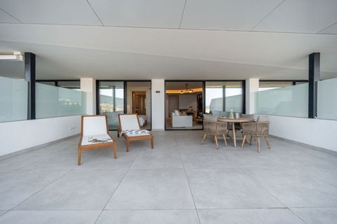 The home enjoys panoramic sea views from its elevated position, with a tiered architectural design that follows the natural slope of the land. Inside, you'll find a bright and open layout with floor-to-ceiling windows, offering a seamless connection between indoor and outdoor living. Interiors are finished with high-quality materials and a calm, modern design.