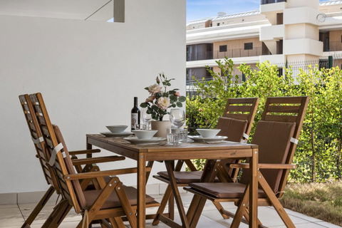 Outdoor living is a highlight of this property, with a private terrace spanning 62m² and a beautifully maintained garden. These spaces provide the perfect setting for morning coffees, al fresco dining, or unwinding under the stars. Residents also have access to a communal pool, complete with a children's area, and a fitness centre, ensuring a balanced lifestyle. Additional amenities include a storage room, a communal garage, and a lift for added convenience.