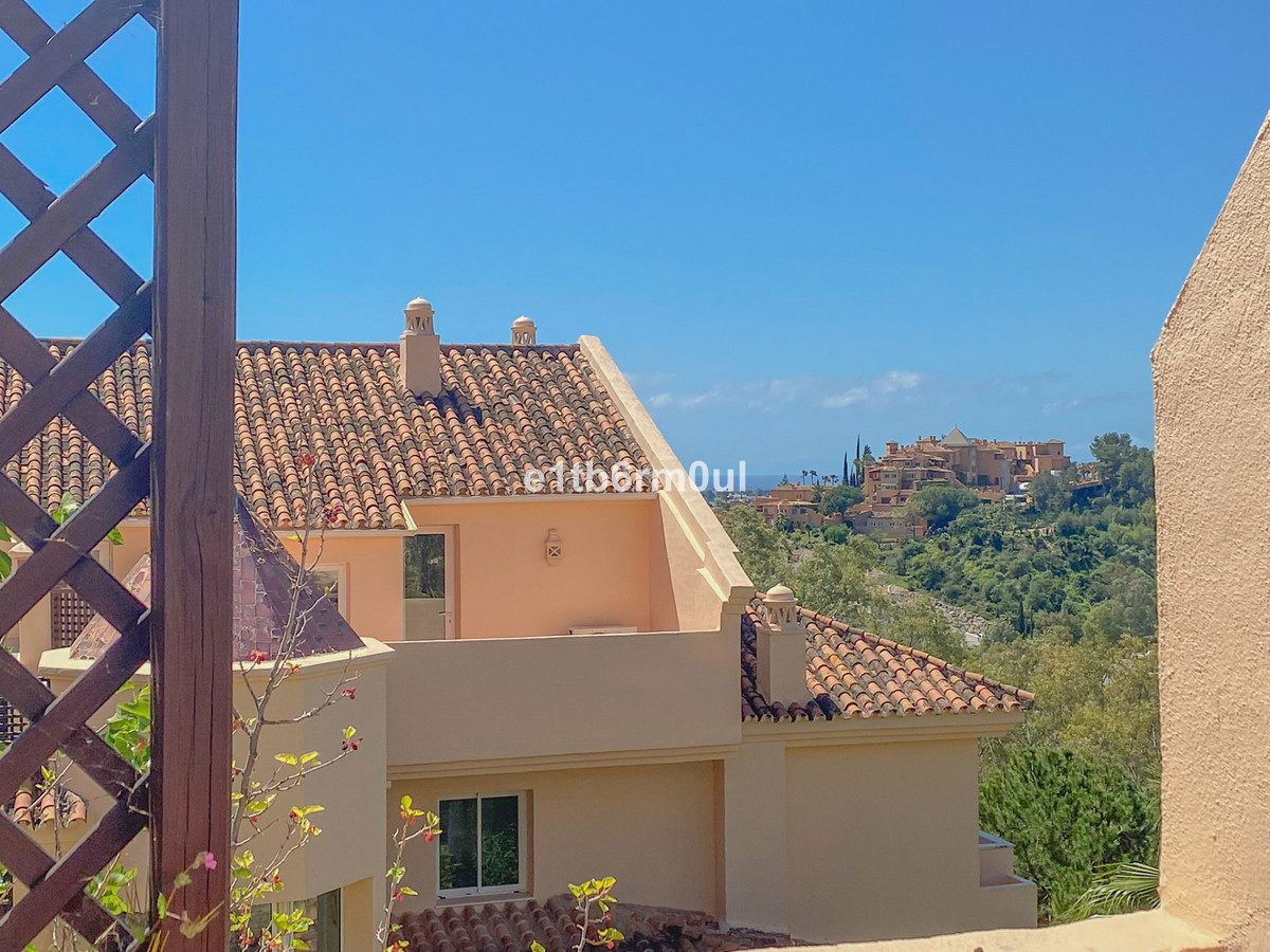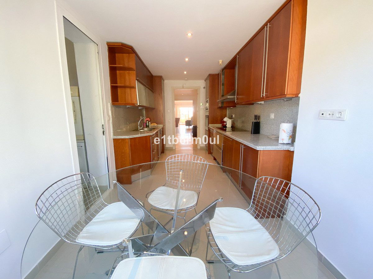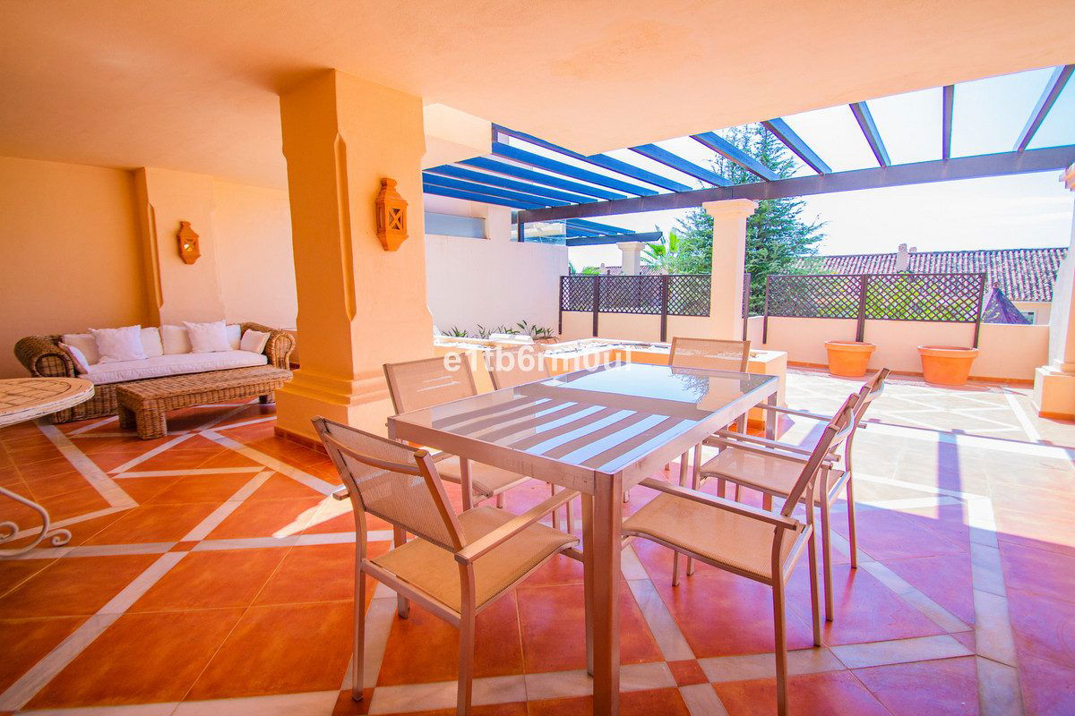 Fully secure gated community offering 24hr security, three outdoor pools, a gym, tennis court, and an indoor swimming pool. Surrounded by golf course in the Golf Valley of Nueva Andalucia this is a perfect apartment for a golf lover. The accommodation consists of a large entrance hallway, galley kitchen with breakfast seating area and laundry room. Large living / dining room with working fireplace. Guest WC. Both bedrooms are ensuite with fitted wardrobes, one bedroom has access to a private terrace. Large terrace with space for a jacuzzi. Carparking space in the communal parking included.