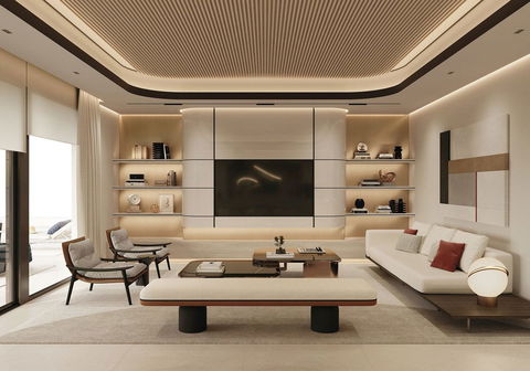 Premium lighting package — black 2700K LED spotlights in the living room, bedrooms and kitchen; recessed ceiling lights; LED strips along skirtings; and ambient lighting in bathroom niches.
