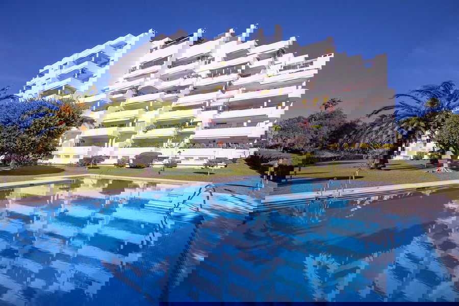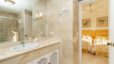 The apartment boasts three generously sized bedrooms and three bathrooms, ideal for both family living and entertaining. A newly renovated kitchen combines sleek design with outstanding functionality, while the expansive living area includes a charming fireplace and stylish marble floors. The southwest-facing orientation floods the space with natural light and offers beautiful sunsets from the large, covered terrace. Beyond the terrace are views of the Guadalmina River with its ever changing scenery.