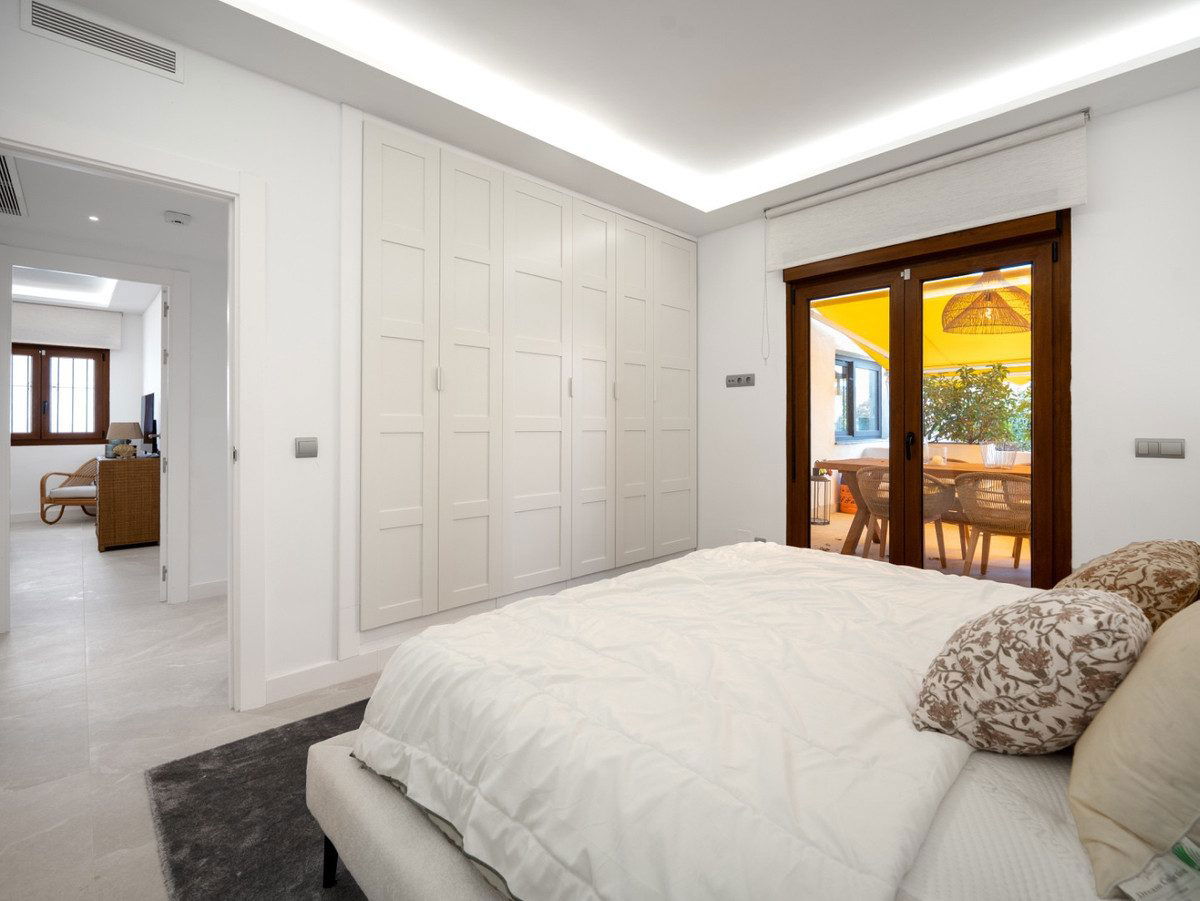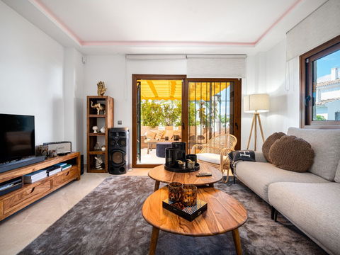 This stunning ground floor apartment, Apartment Aldea Blanca, offers a rare opportunity with three bedrooms and two bathrooms, all beautifully renovated in 2025. The open plan living and dining area flows seamlessly to a fully fitted modern kitchen. Large glass doors lead out to two private terraces, one directly off the master bedroom, perfect for outdoor dining or relaxation.