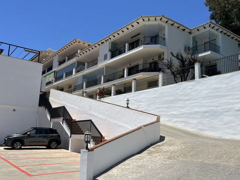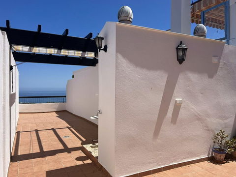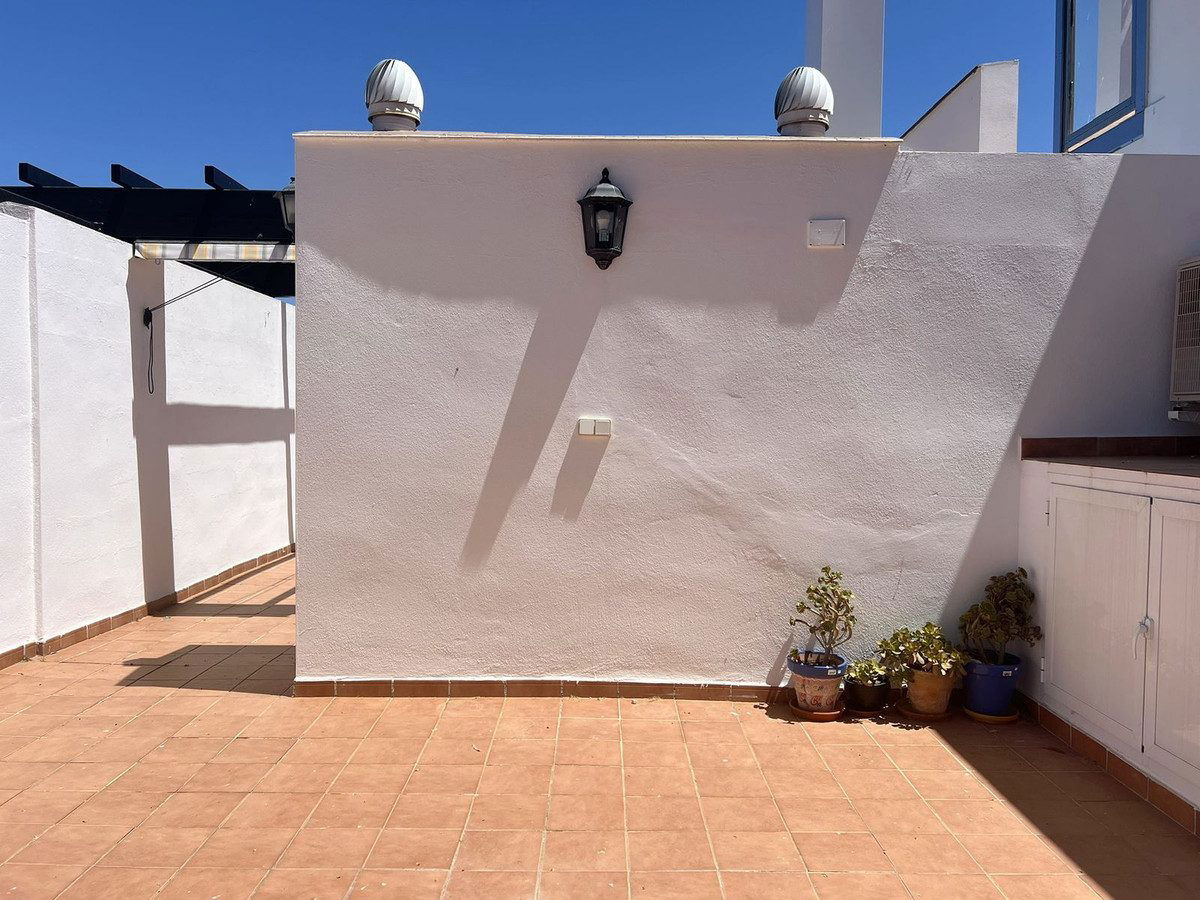 Entrance hall. Lounge-dining room with A/C h+c, ceiling fan and sliding doors to enclosed sunny terrace with folding glass curtains. Shower room. Master bedroom with wardrobes and sliding doors to the enclosed terrace. This sunny enclosed terrace could be a reading room or study if needed. Double glazing. Roller blinds. Marble floors. Ceiling fans. Guest bedroom also has fitted wardrobes. Full bathroom. Fully fitted kitchen with glass-ceramic hob, fridge-freezer, oven, extractor fan and granite counter-top. Small front patio has spiral stairs that lead up to spacious ROOF-TOP TERRACE with those outstanding PANORAMIC views to the whole coast. There are new storage units, an outdoor shower, and plenty of space for BBQ and dining "al fresco"– a great place to chill out. Communal swimming pool, well-maintained gardens and a designated parking space. All within a peaceful gated complex only a short walk from Mijas center. Walking distance to all amenities. Near bus stop. VIEWINGS RECOMMENED!