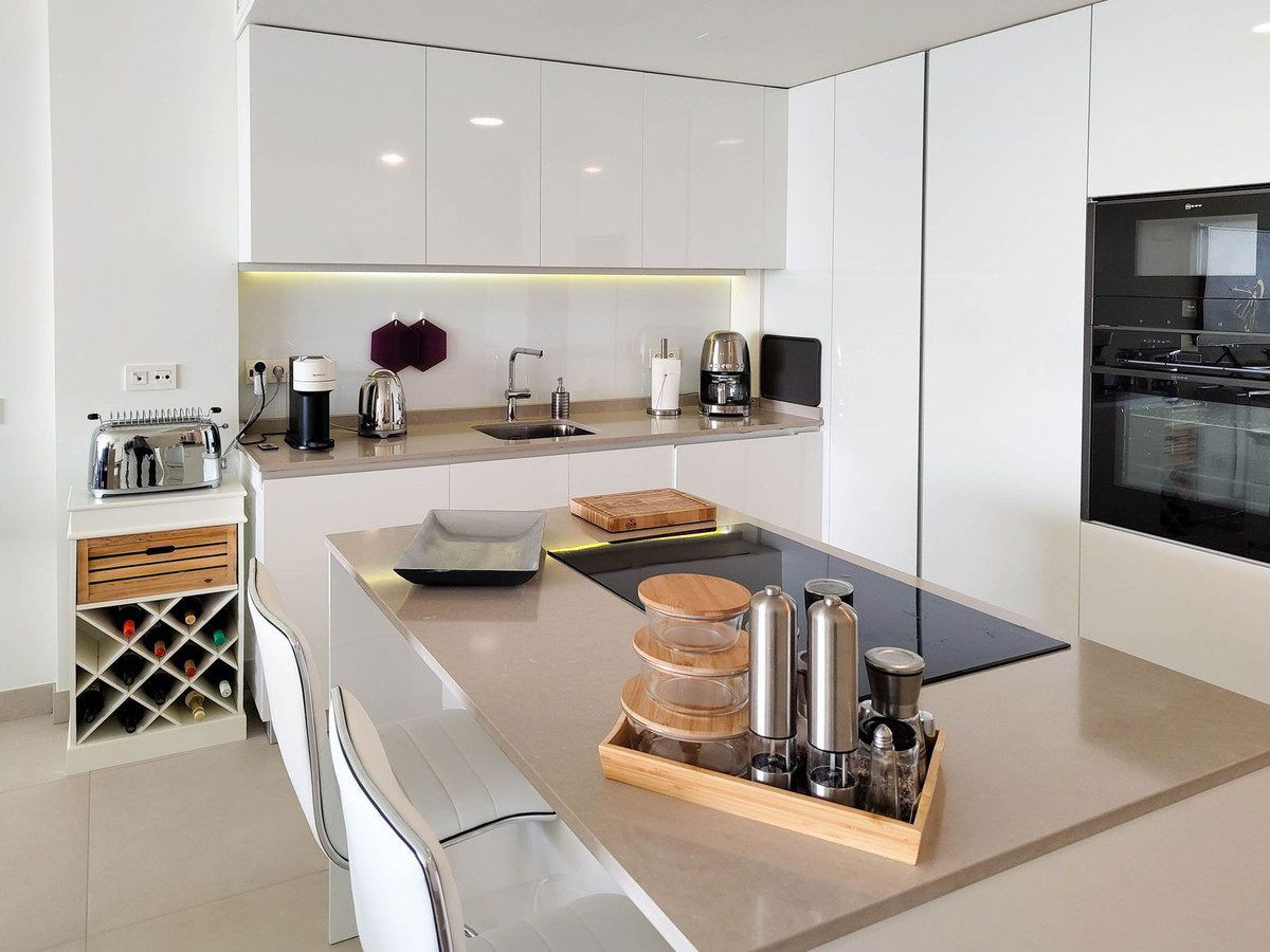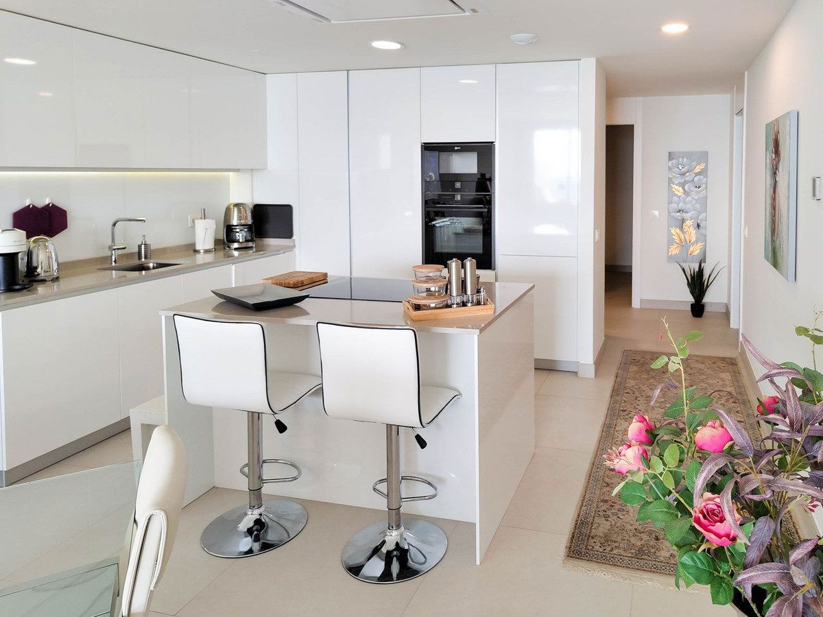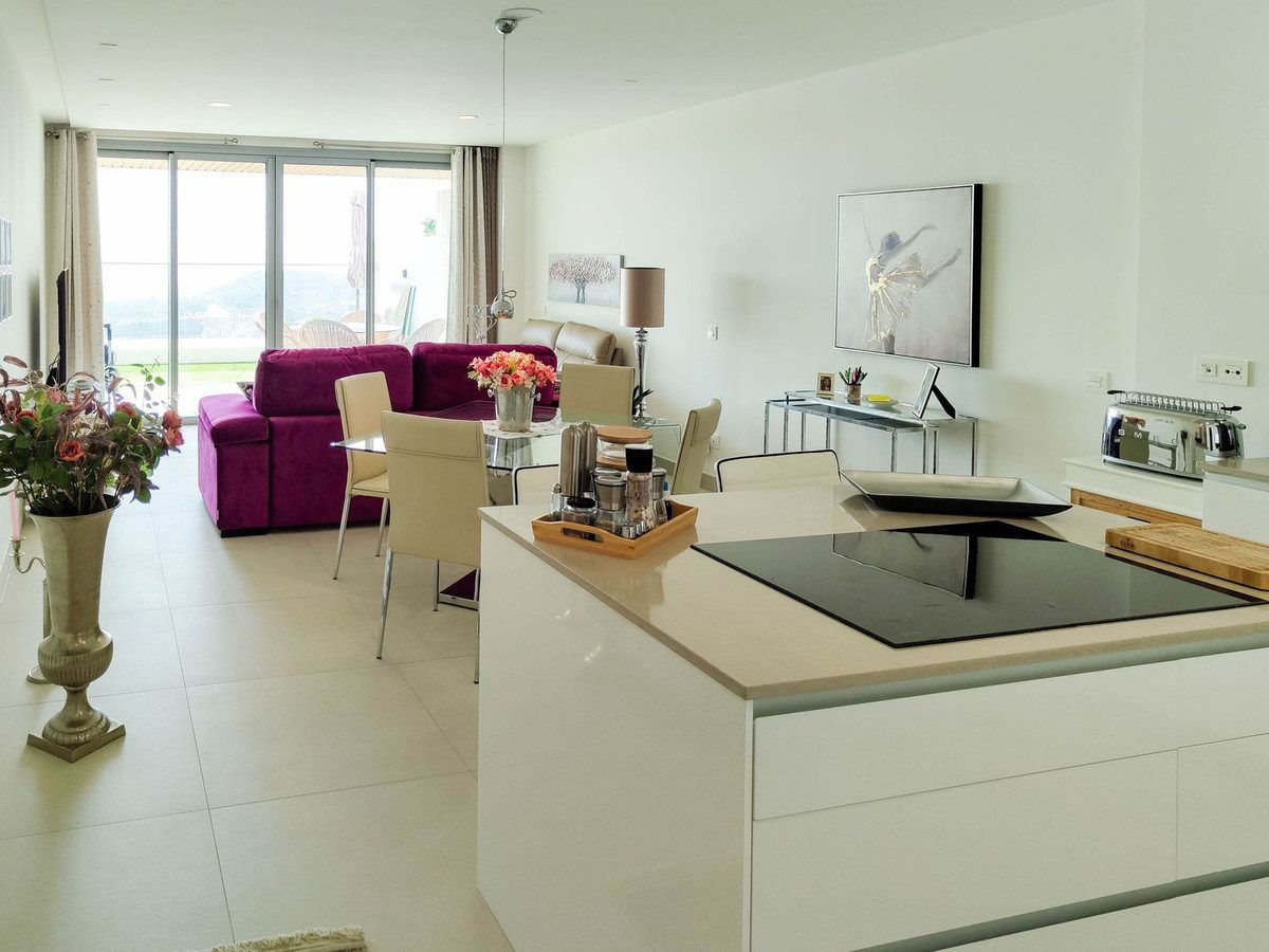 The open-plan kitchen – with sea views – flows seamlessly into the living area and lounge, creating an ideal environment for entertaining and interacting. Equipped with state-of-the-art appliances and a smart layout, this kitchen is a space where functionality meets modern design. From here, you can access the extra-large terrace, which offers panoramic views of the sea, golf, and mountains and is perfect for al fresco dining, relaxing in the sun, or enjoying the scenery. The covered section of the terrace has been enclosed with Lumon glass curtains, making it a versatile space to be enjoyed comfortably throughout the year, while still preserving the open views and natural light.