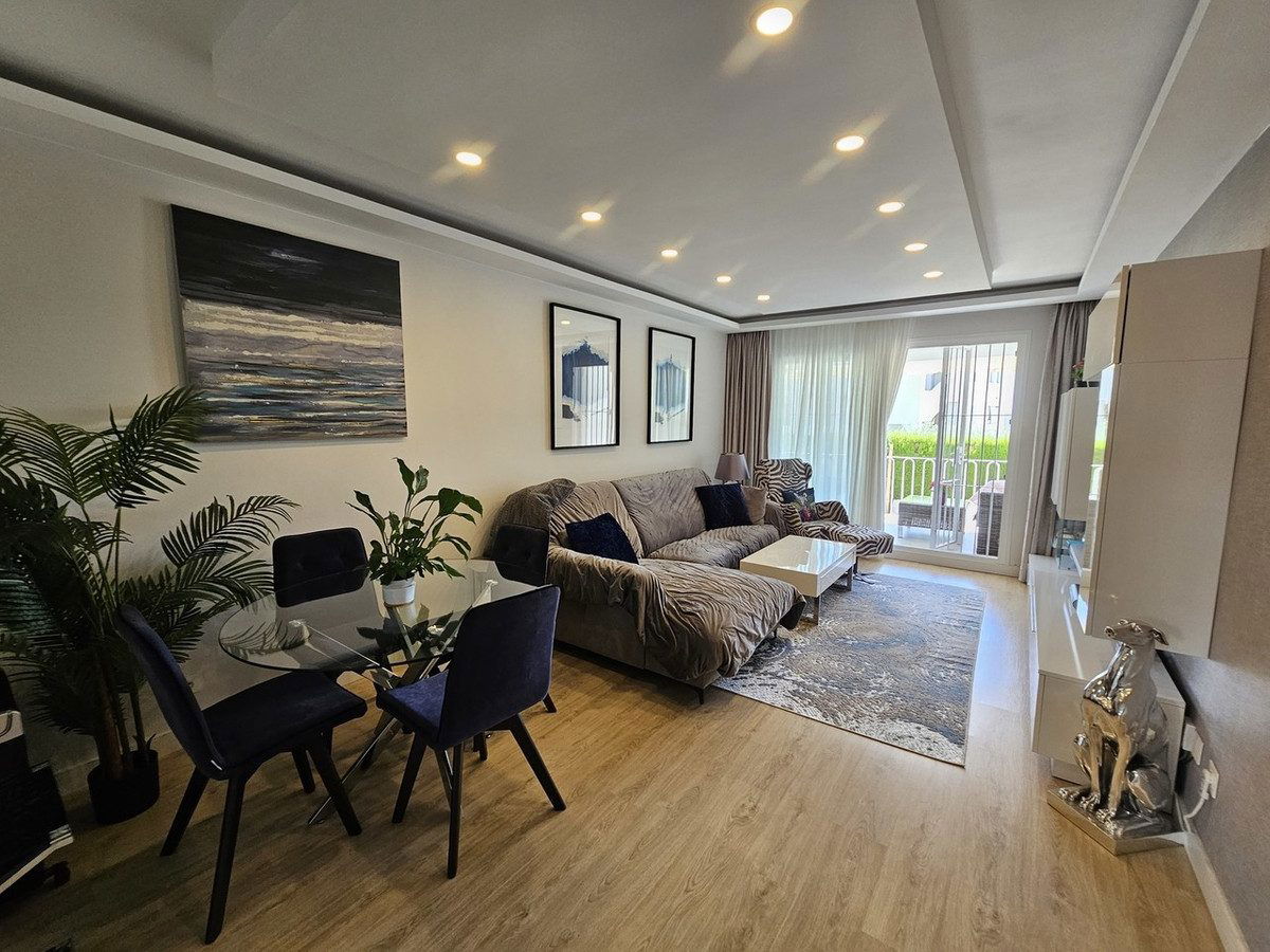 Tucked inside the tranquil Sun Garden residential complex in Estepona East, this 80m2 ground-floor apartment radiates warmth, space, and a flood of natural sunlight. It features two spacious bedrooms and two sleek bathrooms, and is being sold fully furnished—ready for you to move in without lifting a finger. Once you enter you'll find a bright, expansive living room that opens directly onto a 22m2 covered terrace, leading to a 54m2 private south-facing garden. It's a prime spot for basking in the Mediterranean light from dawn until dusk.
