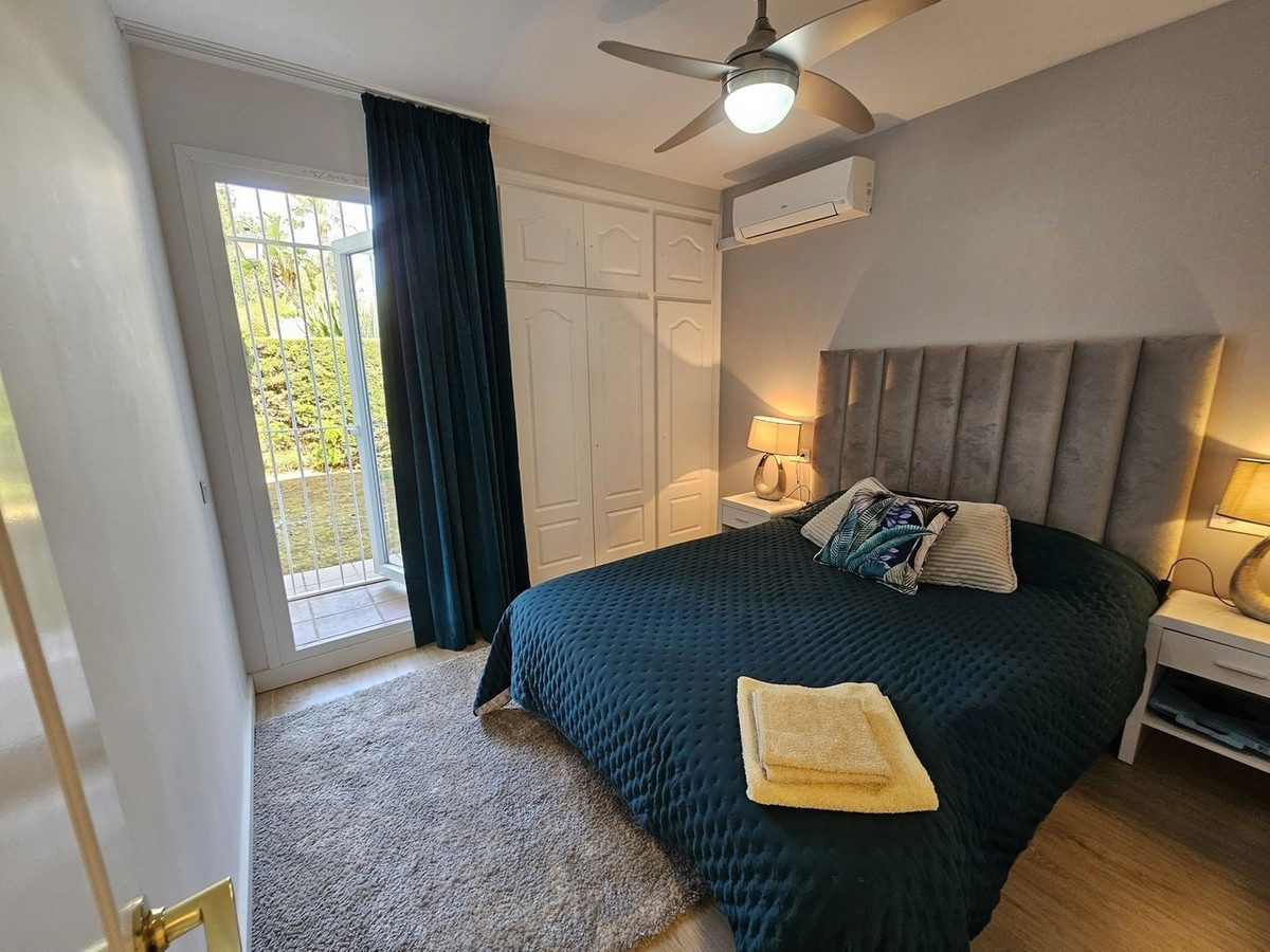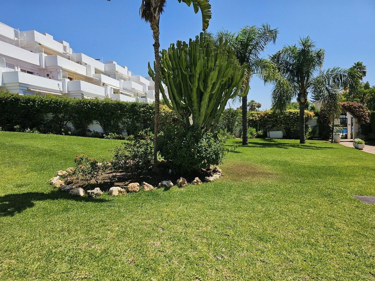 Further down the hallway, a fully fitted kitchen sits on the left, complete with access to a second, 11m2 garden space—perfect for morning coffee. Thanks to its south-facing orientation, the apartment remains light-filled throughout the day, creating a welcoming and cheerful atmosphere. Location is another standout-just 15 minutes from Marbella and Estepona, and between 4 to 8 minutes from El Paraiso and Atalaya Golf clubs. It's a mere 10 to 15-minute stroll to the beach, with shops, restaurants, and essential services only steps away.